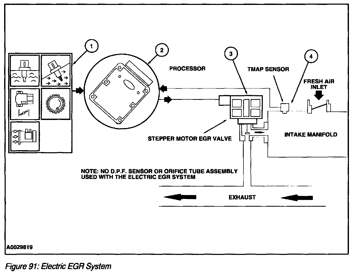 The Electric EGR system consists of an electric motor/EGR valve integrated assembly, a PCM, and connecting wiring. Additionally a MAP sensor is also required. Operation of the system is as follows (Figure 91):