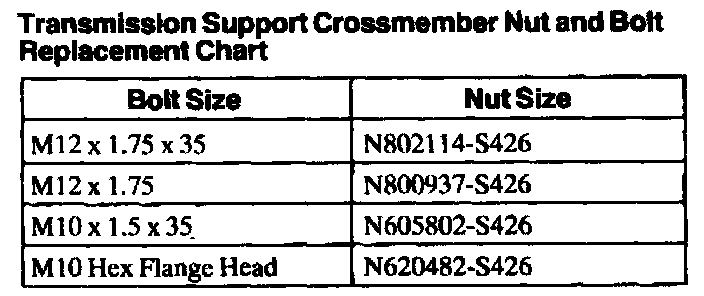 Transmission Support Crossmember Nut And Bolt Replacement Chart: