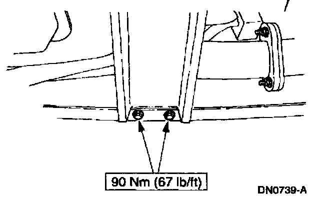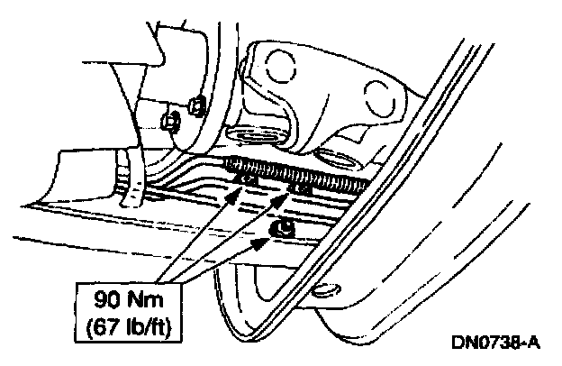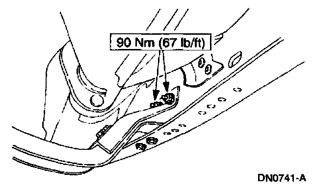 7. Tighten the transmission support crossmember nuts and bolts (RH side) to specification.