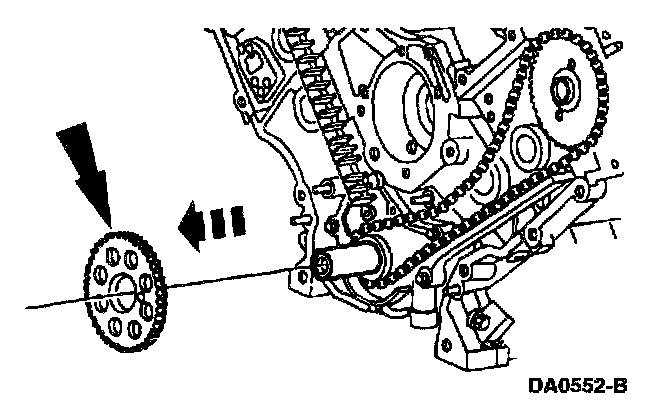10. Position the crankshaft sprocket and lower end of the LH (inner) timing chain, aligning the timing marks. Long hub on sprocket should face forward.