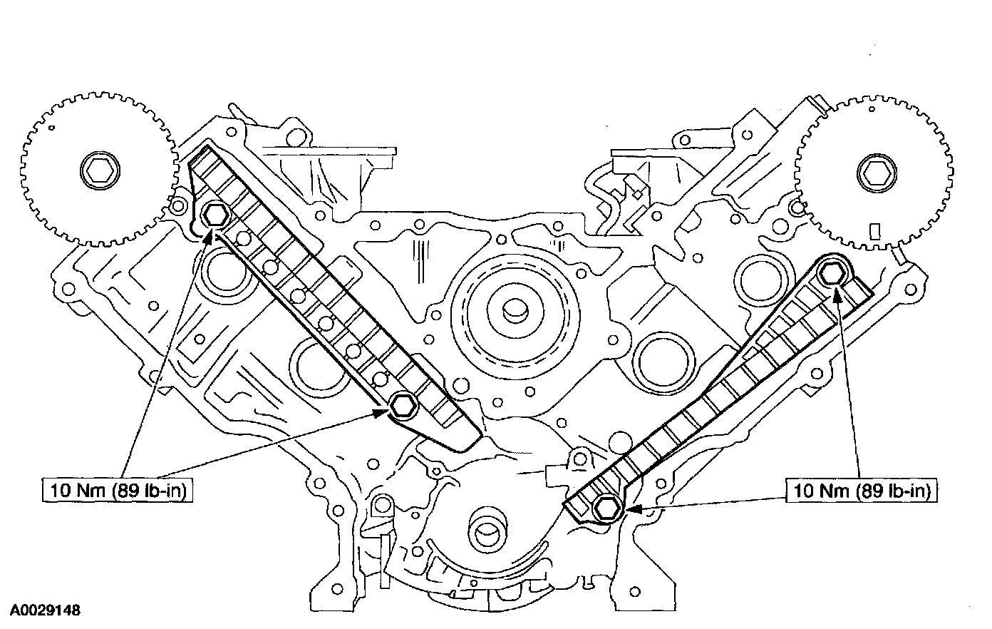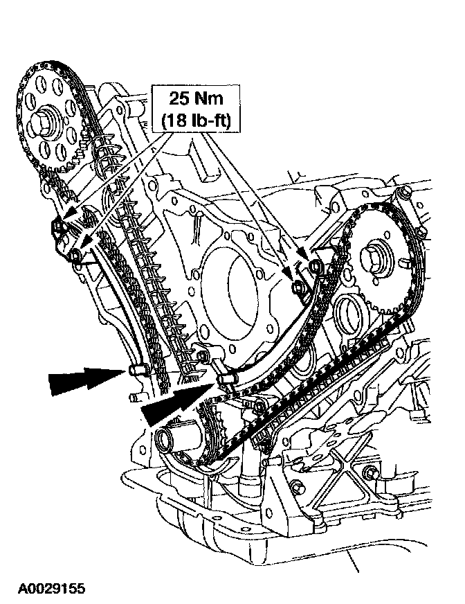 ^ Make sure the upper half of the timing chain is below the tensioner guide dowel. If necessary, use the Camshaft Positioning Tool to adjust.
