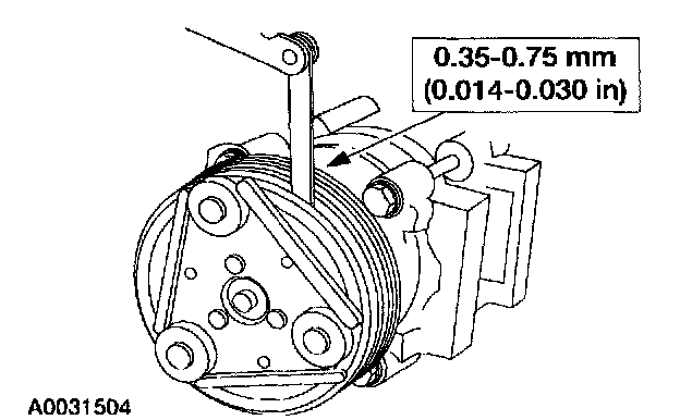 8. Measure and adjust the clutch air gap by removing or adding the A/C clutch hub spacer.