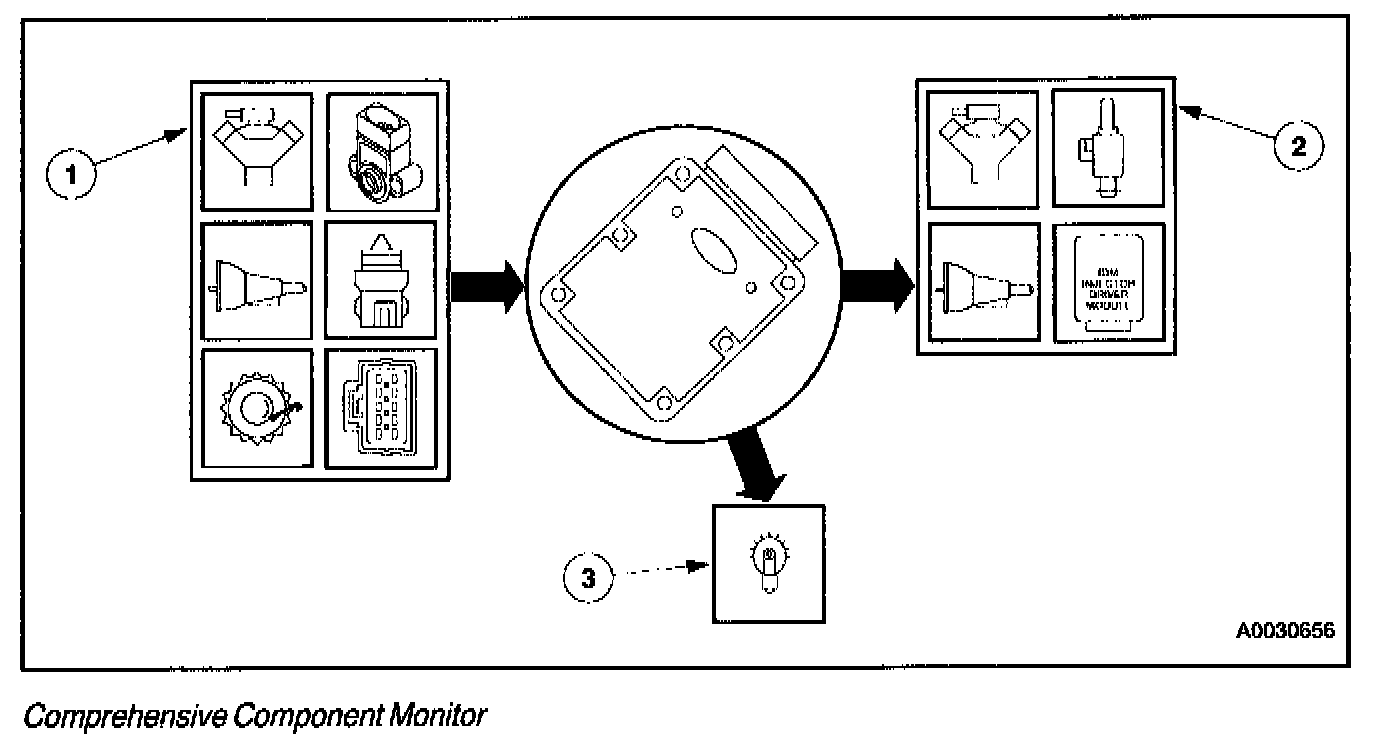The Comprehensive Component Monitor (CCM) is an on-board strategy designed to monitor a fault in any electronic component or circuit that provides input or output signal to the Powertrain Control Module (PCM) and is not exclusively monitored by another monitor system. Inputs and outputs are considered inoperative when a failure exists due to a lack of circuit continuity, out-of-range value, or a failed rationality check.