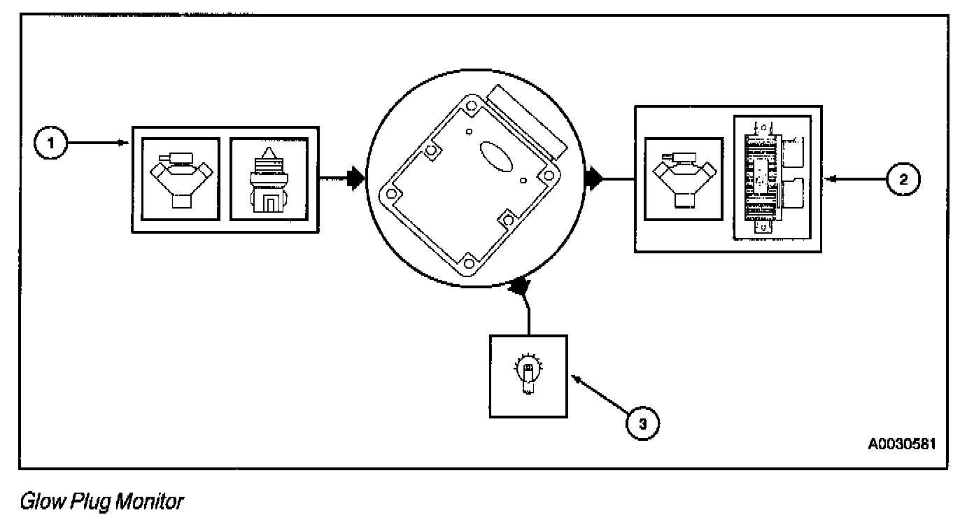 The Glow Plug Monitor Self Test is a functional Key On Engine Running (KOER) test of the Powertrain Control Module (PCM) performed on demand with the engine running and the A/C off. The PCM will activate the GPCM which monitors the glow plugs. The pedal may be used to increase the engine speed to increase voltage if needed. A fault must be present at the time of testing for the test to detect a fault. The trouble codes will be sent to the PCM on the diagnostic line and outputted to the scan tool.