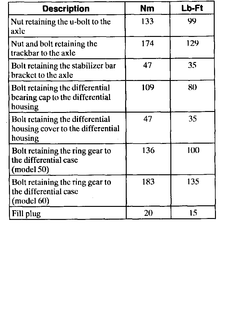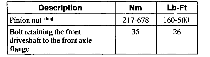 c For new pinion bearing installation on model 50 and 60 axles, tighten the pinion nut to a rotating torque of 1.7-3.4Nm (15-30 lb-in) (217-678 Nm[160-500 lb-ft]).