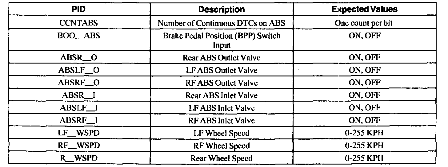 ABS Control Module Parameter Identification (PID) Index