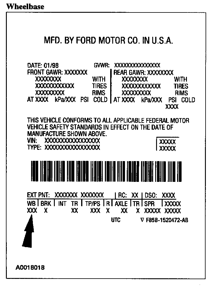 The upper portion of the Vehicle Certification (VC) label contains the manufacturer name, the month and year of manufacture, the certification statement, and the VIN. It also includes gross Vehicle Weight Ratings (GVWR).