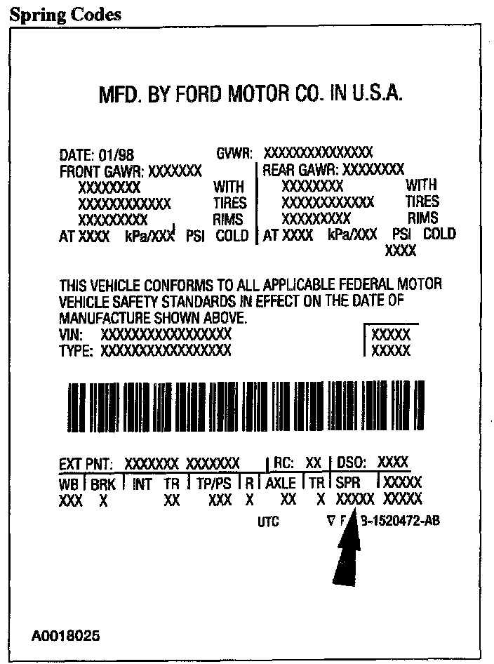 Spring codes are listed as a two-part code. The first character identifies the front spring/torsion bar code. The second character identifies the rear spring code.