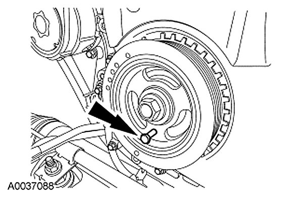 2. NOTICE: Do not loosen or remove the crankshaft pulley bolt without first installing the special tools as instructed in the crankshaft pulley procedure. The crankshaft pulley and the crankshaft timing sprocket are not keyed to the crankshaft. The crankshaft, the crankshaft sprocket and the pulley are fitted together by friction, using diamond washers between the flange faces on each part. For that reason, the crankshaft sprocket is also unfastened if the pulley bolt is loosened. Before any repair requiring loosening or removal of the crankshaft pulley bolt, the crankshaft and camshafts must be locked in place by the special tools, otherwise severe engine damage can occur.