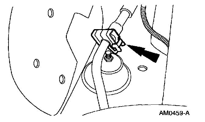 2. Access and disconnect the condenser to evaporator line [1][2]spring lock coupling from the evaporator core inlet. See: Spring Lock Coupling Disconnect Procedure.