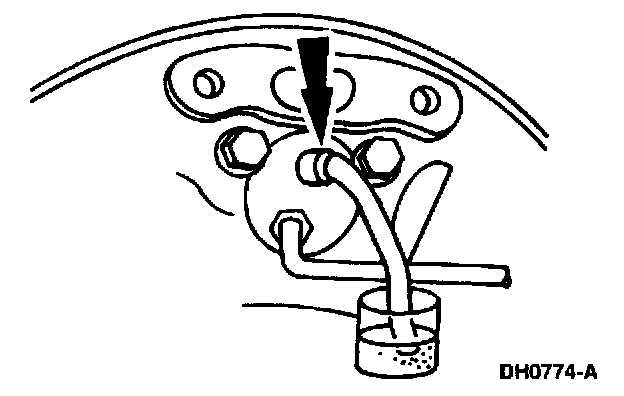 2. Place a box end wrench on the RH rear bleeder screw. Attach a rubber drain tube to the RH rear bleeder screw and submerge the free end of the tube in a container partially filled with clean brake fluid.