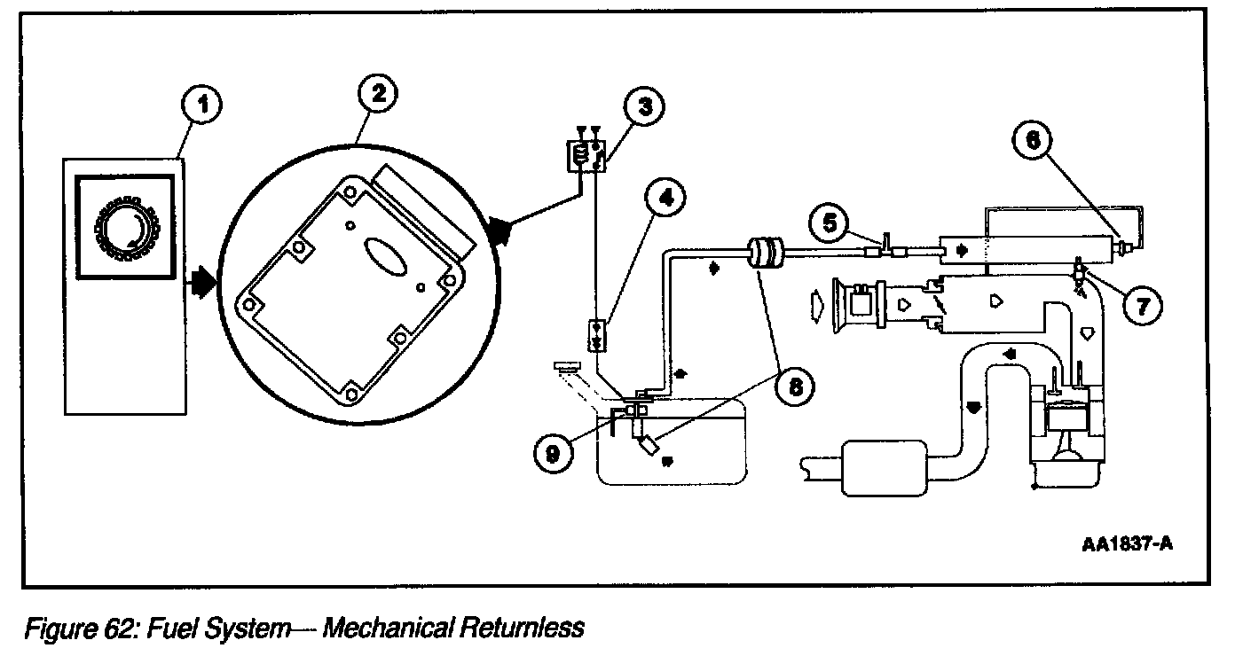 The fuel system consists of a fuel tank with reservoir, fuel pump, fuel pressure regulator, fuel filter, fuel supply line, fuel rail, fuel rail pulse damper, fuel injectors, and schrader/pressure test point. Operation of the system is as follows (Figure 62):