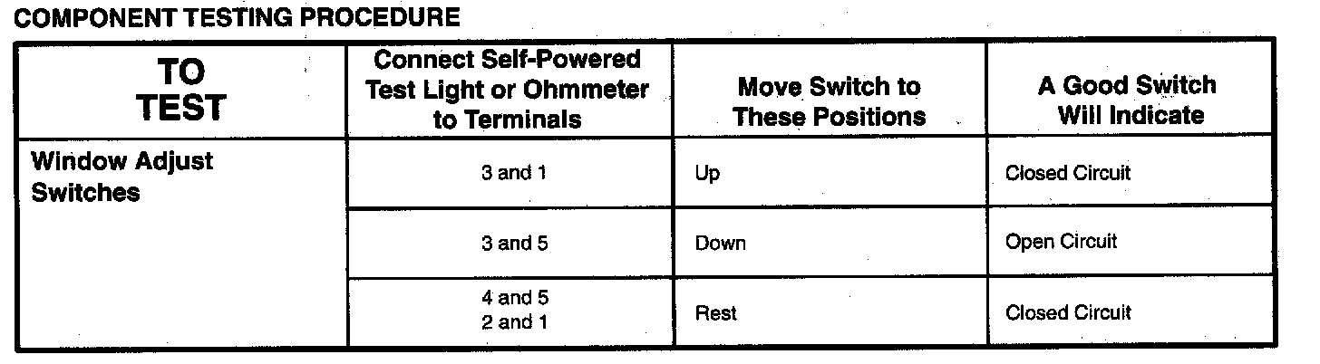 The component connector MUST BE REMOVED before testing. To test a single circuit within the component, select that circuit under the column TO TEST. If you wish to test the complete component, perform all tests.