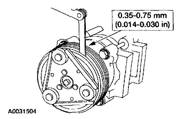 8. Measure and adjust the clutch air gap by removing or adding A/C clutch hub spacers.