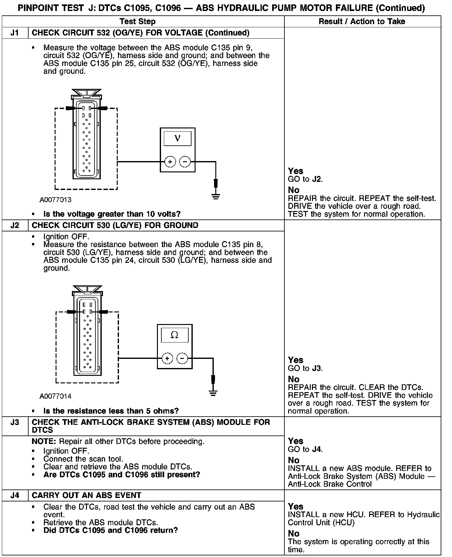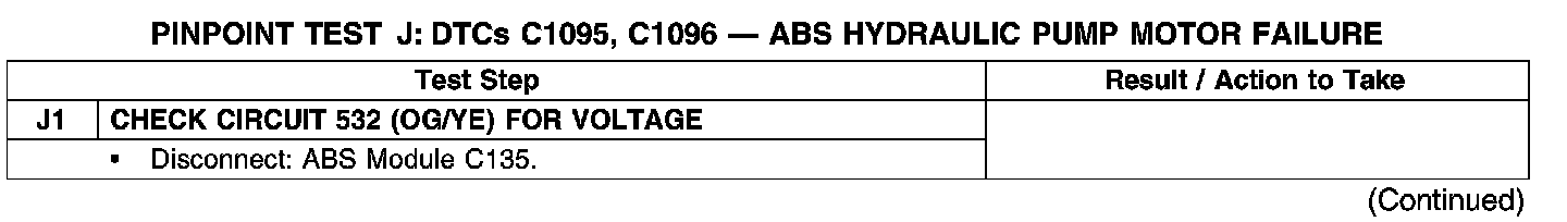 PINPOINT TEST J: DTCs C1095, C1096-ABS HYDRAULIC PUMP MOTOR FAILURE