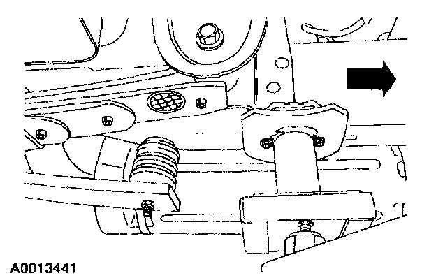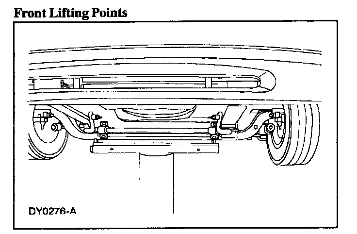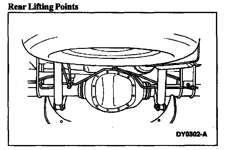 ^ When raising a vehicle on a twin-post hoist, use care when positioning the vehicle so that the hoisting forks do not interfere with the shock absorber mounting brackets or stabilizer mounting brackets, if so equipped, or damage the axle carrier or rear cover.