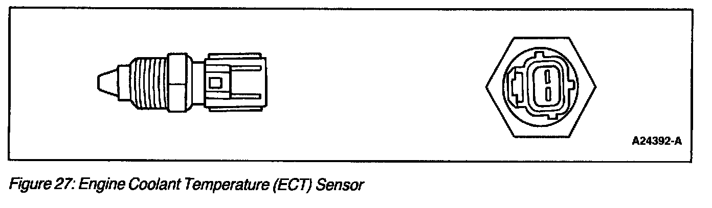 The Engine Coolant Temperature (ECT) sensor (Figure 27) is a thermistor device in which resistance changes with temperature. The electrical resistance of a thermistor decreases as the temperature increases, and increases as the temperature decreases. The varying resistance affects the voltage drop across the sensor terminals and provides electrical signals to the PCM corresponding to temperature.