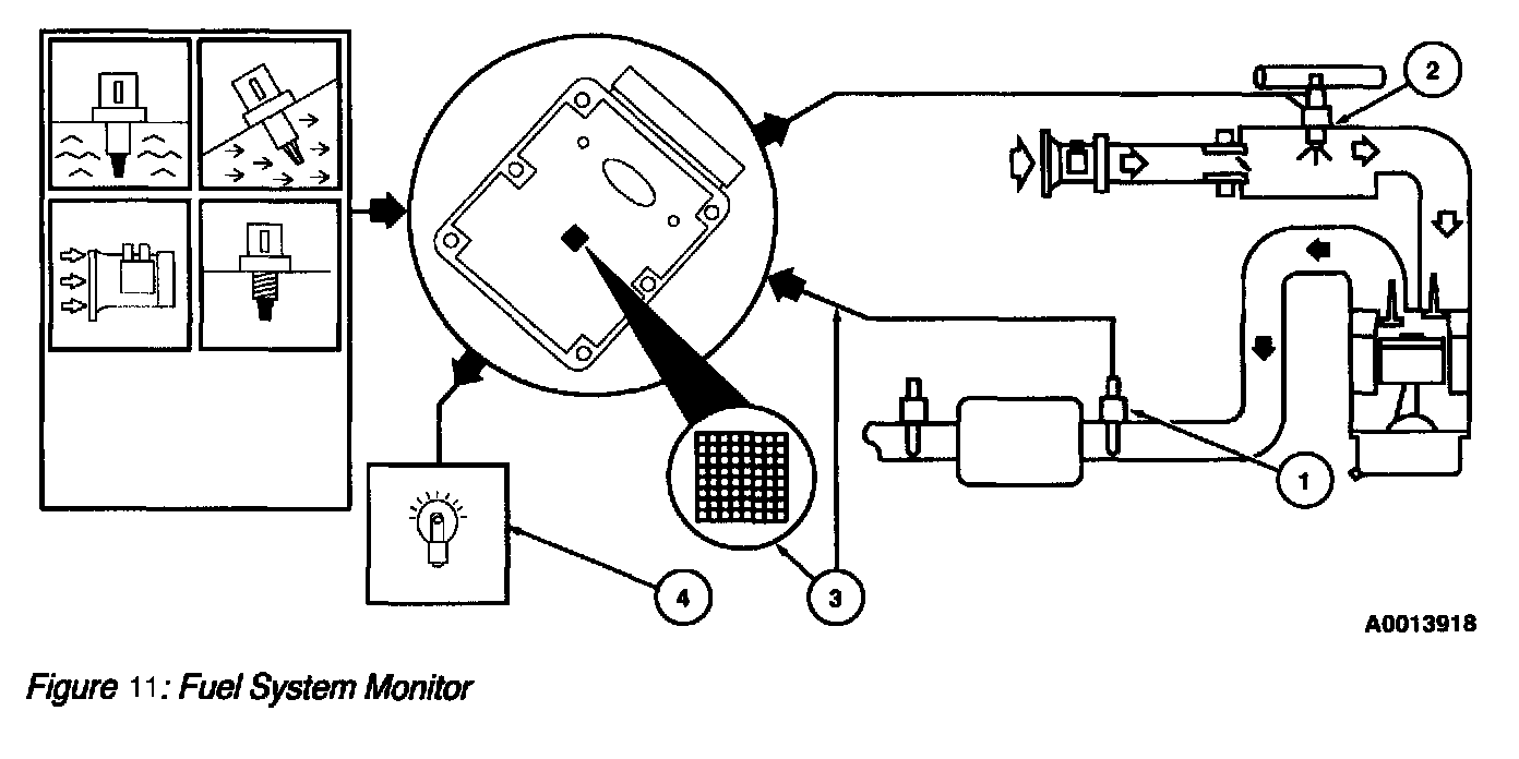 The Fuel System Monitor is an on-board strategy designed to monitor the fuel trim system. The fuel control system uses fuel trim tables stored in the Powertrain Control Module (PCM)'s Keep Alive Random Access Memory (RAM) to compensate for variability in fuel system components due to normal wear and aging. During closed-loop vehicle operation, the fuel trim strategy learns the corrections needed to correct a "biased" rich or lean fuel system. The correction is stored in the fuel trim tables. The fuel trim has two means of adapting; a Long Term Fuel Trim and a Short Term Fuel Trim. Long Term relies on the fuel trim tables and Short Term refers to the desired air/fuel ratio parameter "LAMBSE". Both are described in greater detail under Powertrain Control Software, Fuel Trim. Input from the Engine Coolant Temperature (ECT), or Cylinder Head Temperature (CHT), Intake Air Temperature (IAT), and Mass Air Flow (MAF) sensors is required to activate the fuel trim system, which in turn activates the Fuel System Monitor. Once activated, the Fuel System Monitor looks for the fuel trim tables to reach the adaptive clip and LAMBSE to exceed a calibrated limit. The Fuel System Monitor will store the appropriate Diagnostic Trouble Code (DTC) when a fault is detected below.