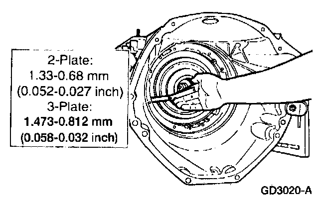 - If the clearance is not to specification, install the correct selective overdrive clutch pressure plate retainer snap ring and recheck the clearance. Refer to the Clutch Plate Usage and Clearance Specification Chart for selective snap ring thicknesses and part numbers.