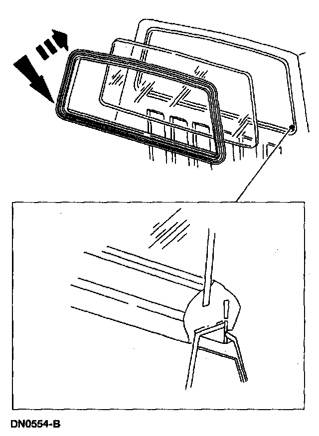 7. From inside the vehicle, pull down on the back window glass weatherstrip and push back the window glass and back window glass weatherstrip from the back window glass opening.