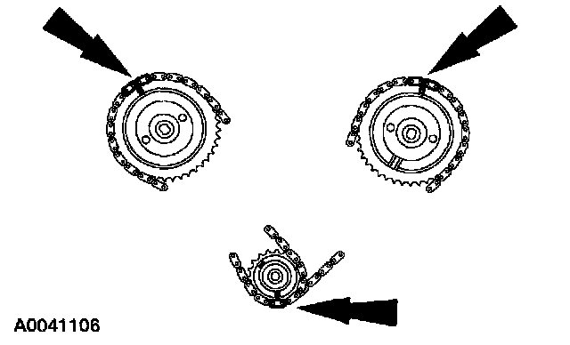 - Position the timing chain on the camshaft sprocket. Make sure the two copper-colored links align with the camshaft sprocket timing mark.
