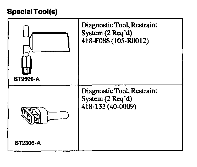 WARNING: THE RESTRAINT SYSTEM DIAGNOSTIC TOOL IS FOR RESTRAINT SYSTEM SERVICE ONLY. REMOVE FROM THE VEHICLE PRIOR TO ROAD USE. FAILURE TO REMOVE COULD RESULT IN INJURY AND POSSIBLE VIOLATION OF VEHICLE SAFETY STANDARDS.