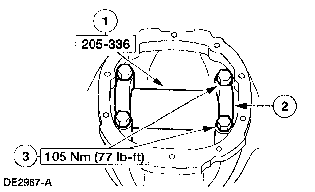 44. Remove the bolts. Apply Stud and Bearing Mount EOAZ-19554-BA or equivalent meeting Ford specification WSK-M2G349-A1 to the bolt threads, and reinstall the bolts.