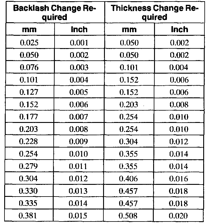 57. To correct for high or low backlash increase the thickness of one differential bearing shim and decrease the thickness of the other differential bearing shim by the same amount. Refer to the following tables when adjusting the backlash. When the backlash is within specifications, proceed to Final assembly.