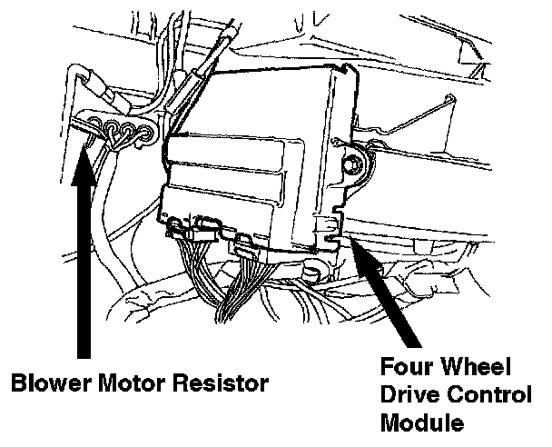 The Blower Motor Resistor is located next to the Four Wheel Drive Control Module.
