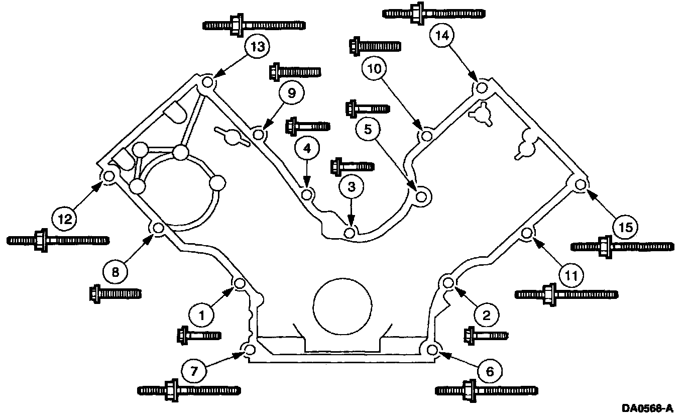 4. Tighten the engine front cover fasteners in sequence in three stages.
