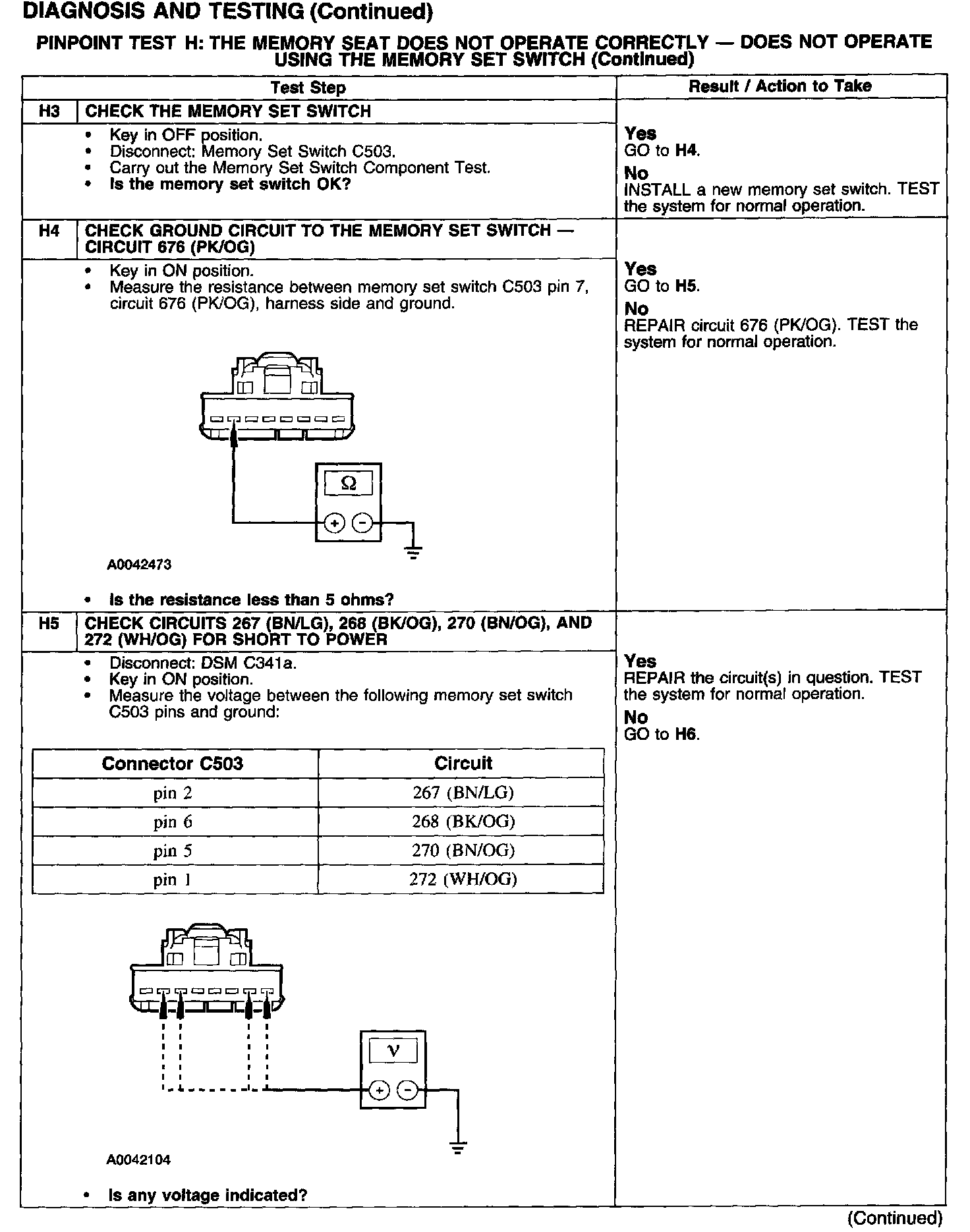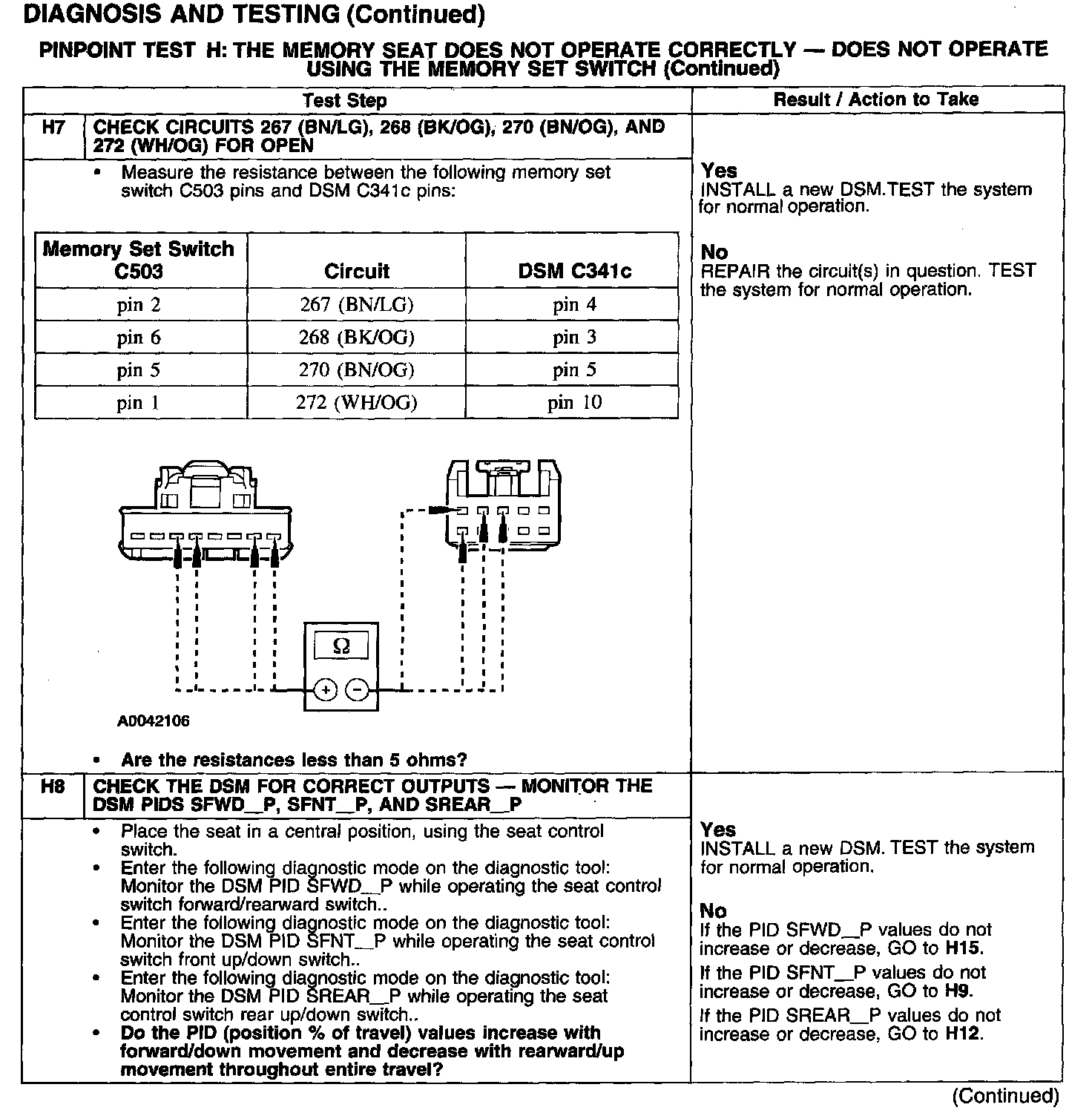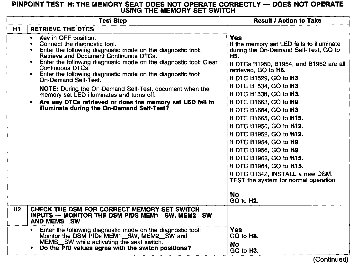 PINPOINT TEST H: THE MEMORY SEAT DOES NOT OPERATE CORRECTLY - DOES NOT OPERATE USING THE MEMORY SET SWITCH