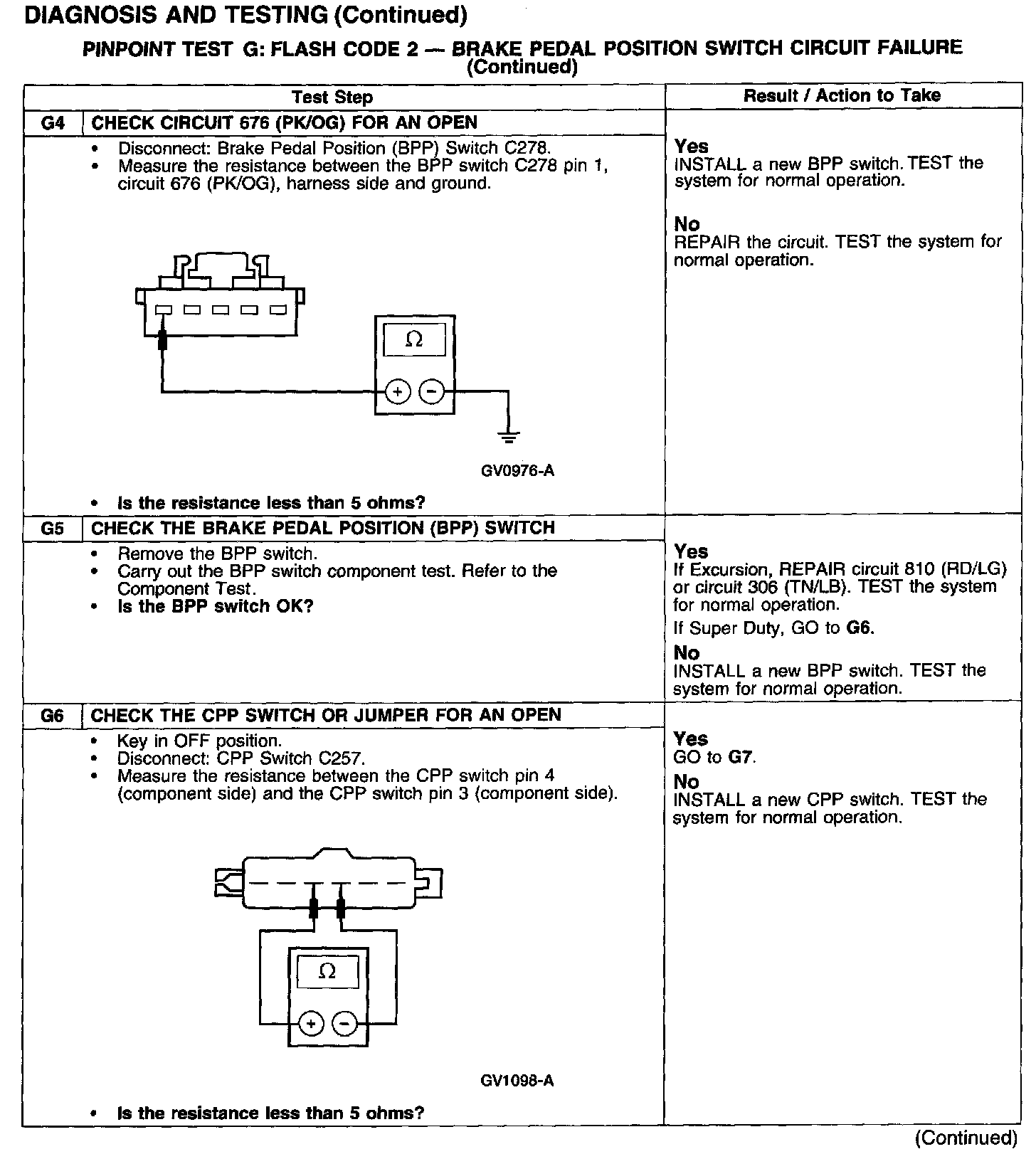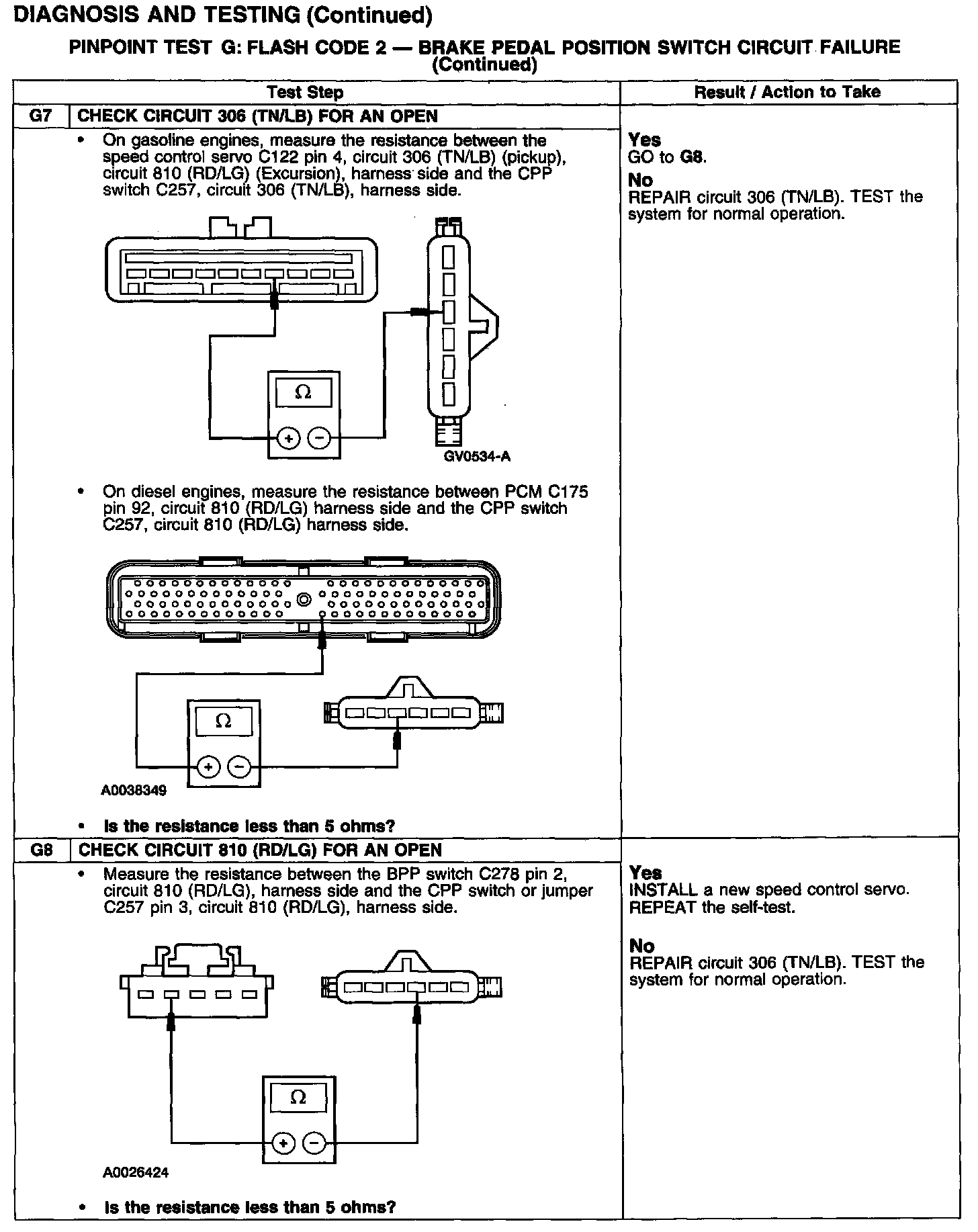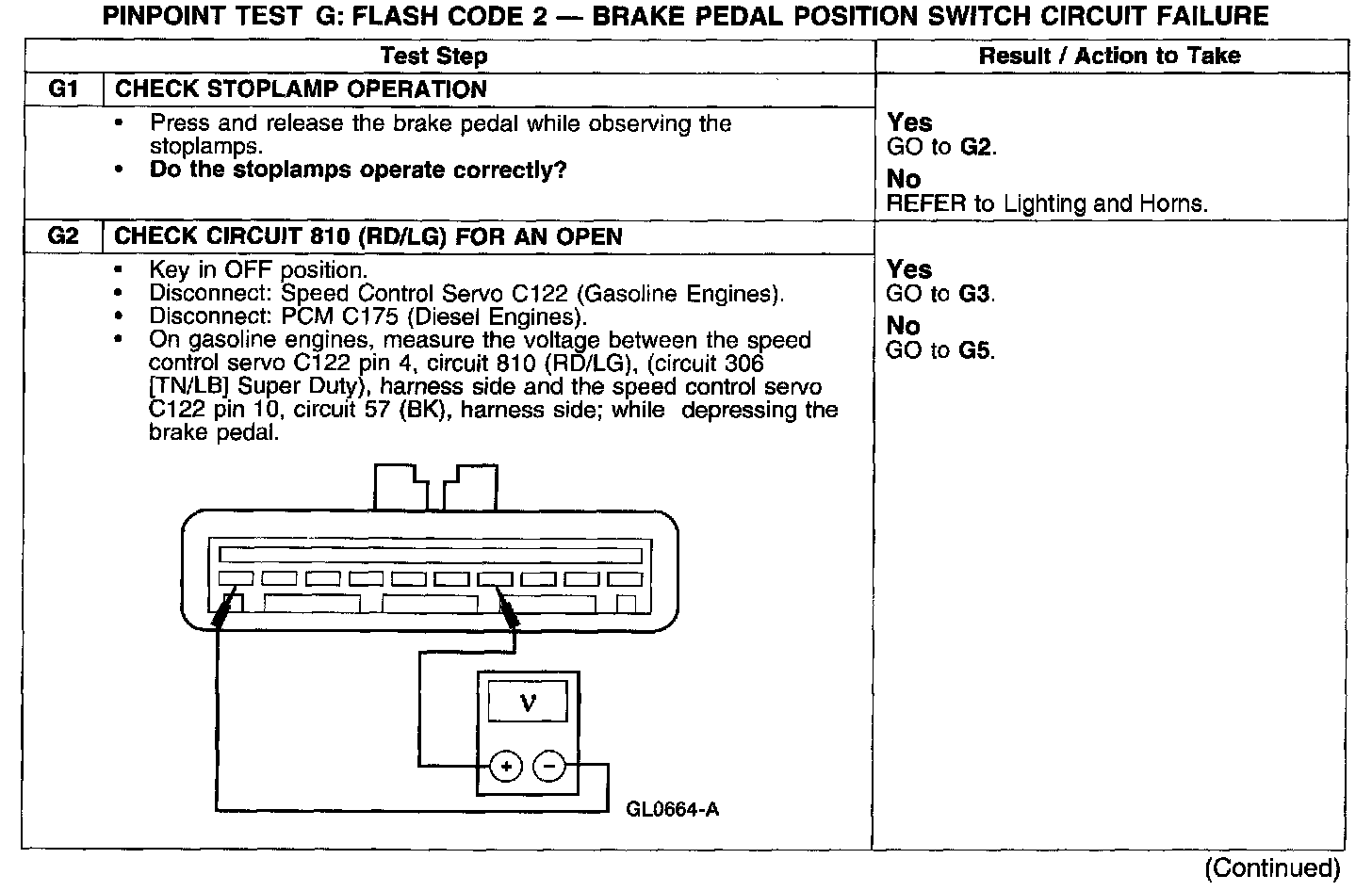 PINPOINT TEST G: FLASH CODE 2 - BRAKE PEDAL POSITION SWITCH CIRCUIT FAILURE