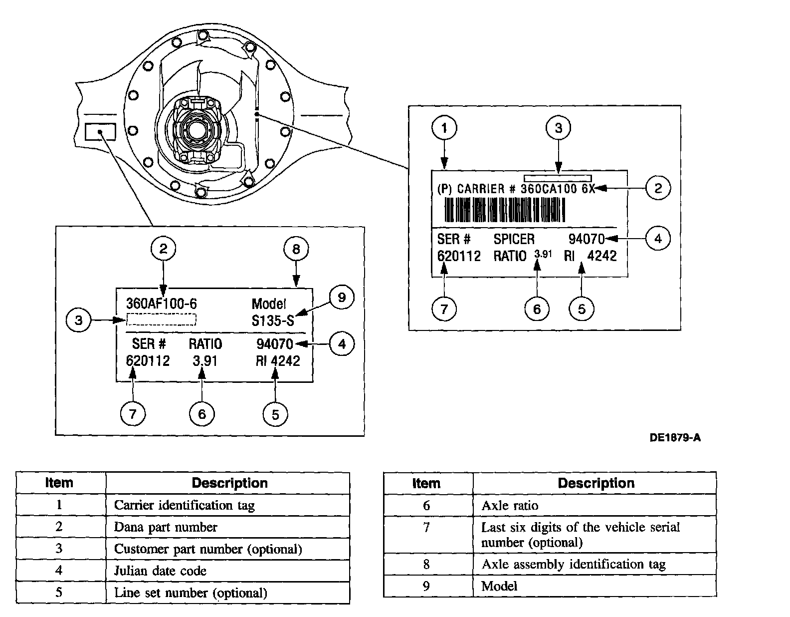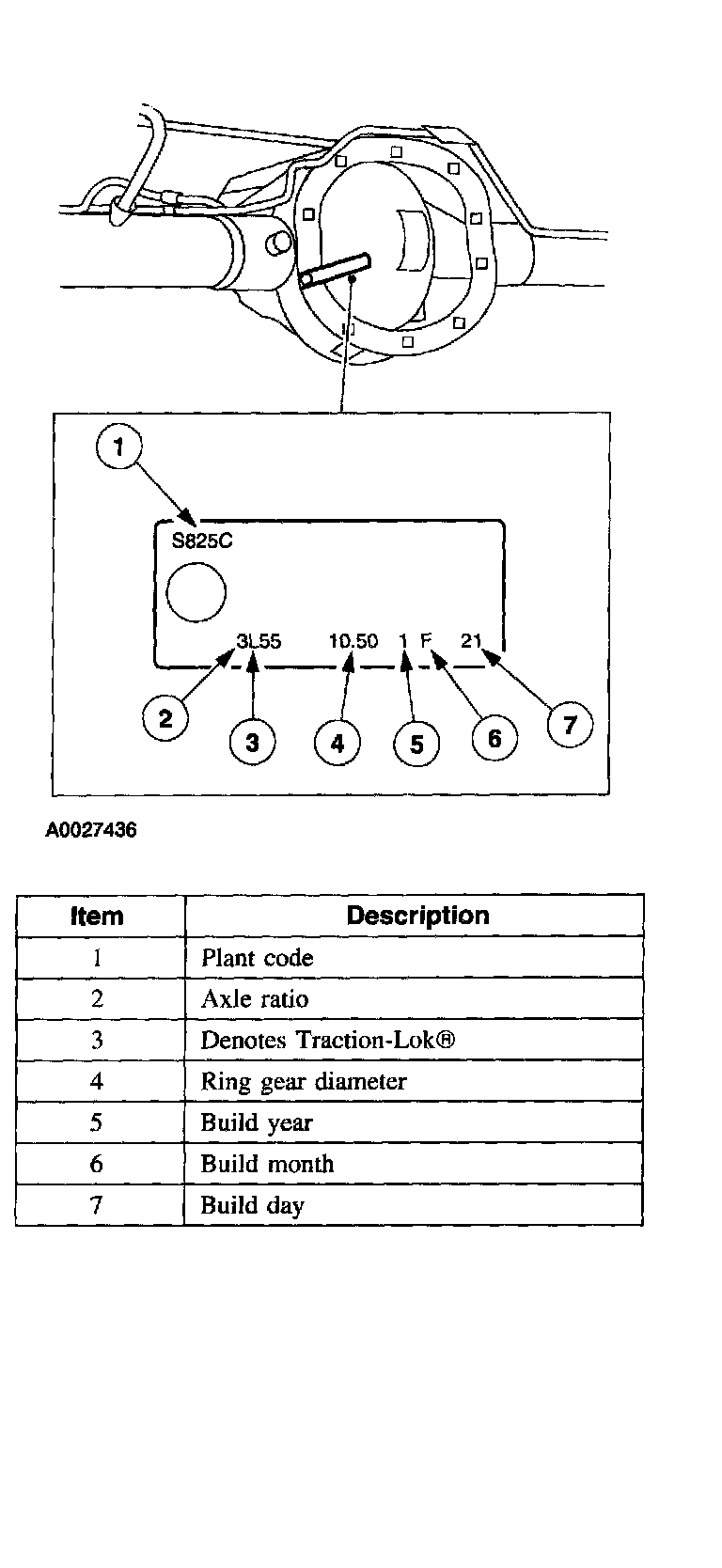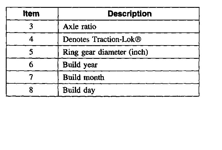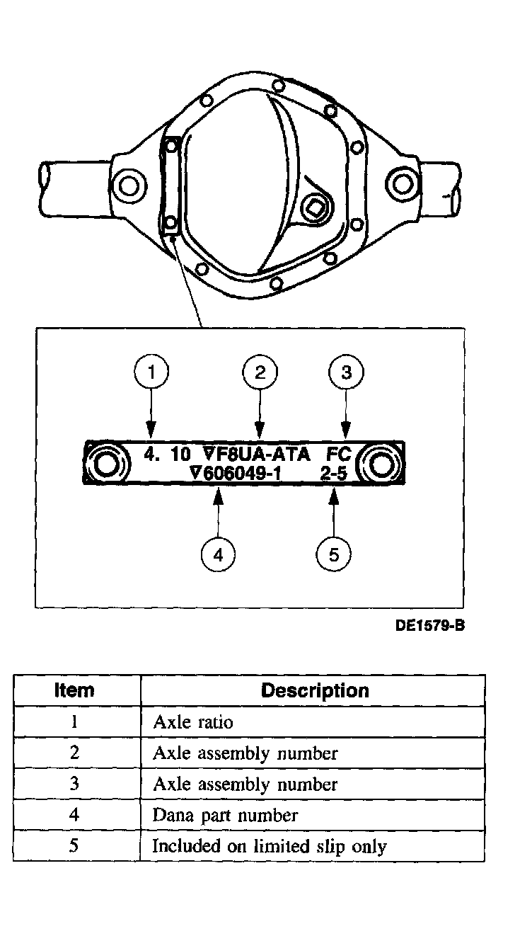 The axle identification tag identifies a particular axle design, a specific ratio, and if it is a conventional or limited slip (Traction-Lok) type. In addition, the plant code will not change as long as that particular axle assembly never undergoes an external design change. If, however, an internal design change takes place during the production life of the axle and that internal change affects parts interchangeability, a dash and numerical suffix is added to the plant code. This means that as an assembly both axles are interchangeable; however, internally they are different. Therefore, each requires different internal parts at the time of repair.