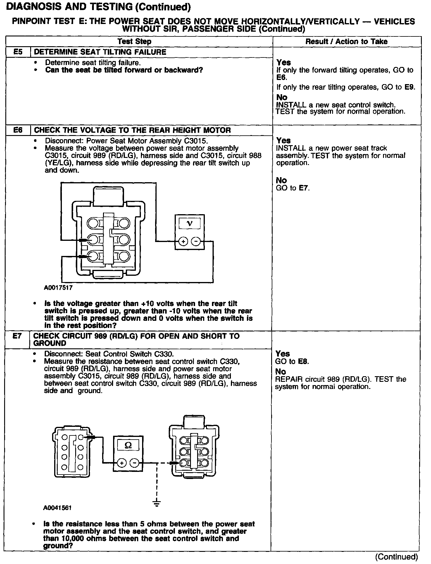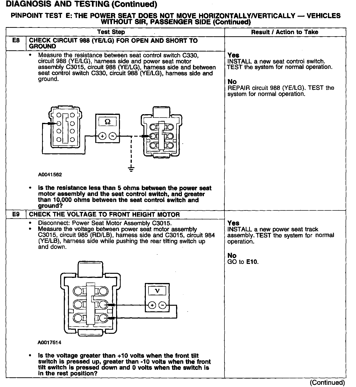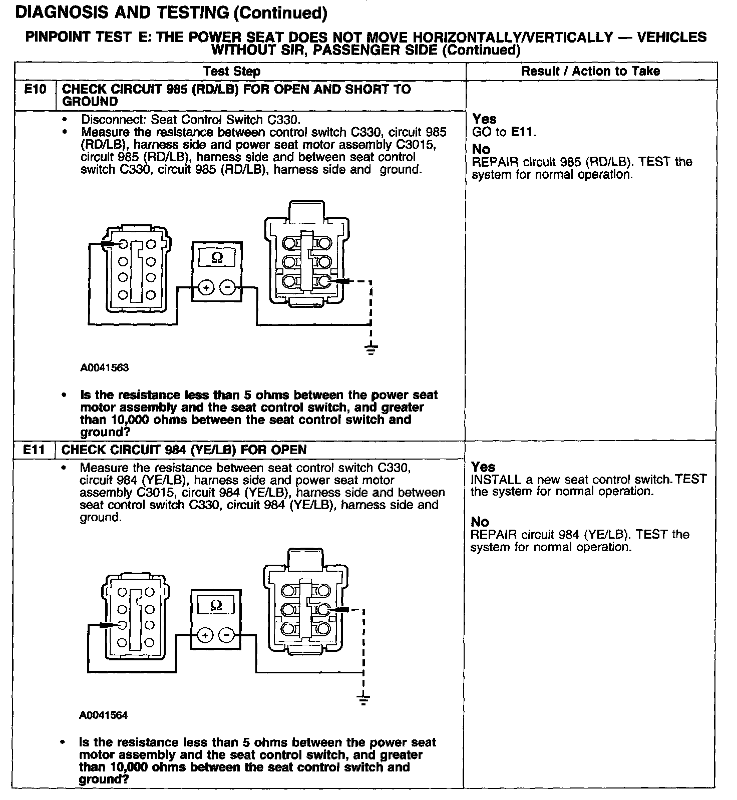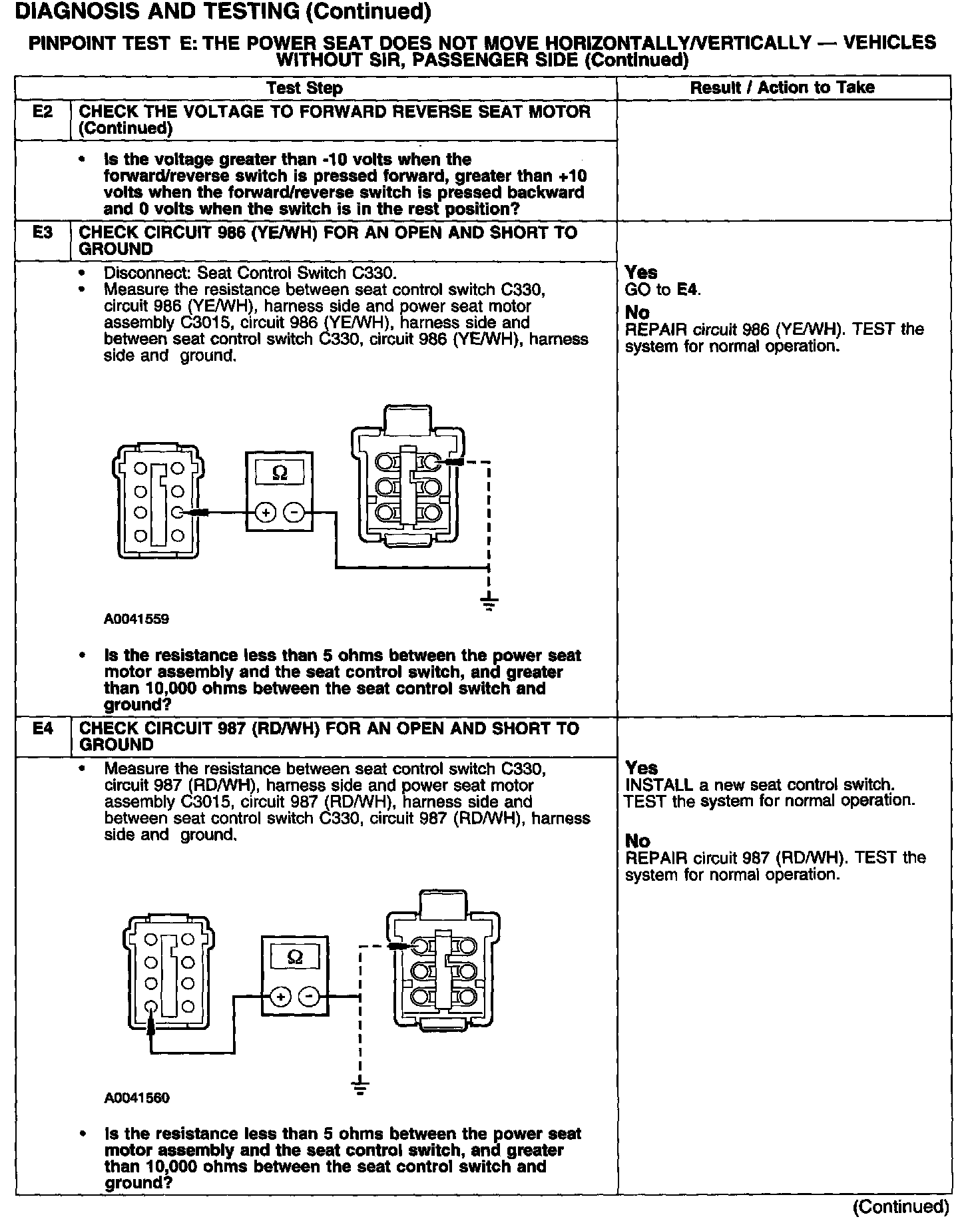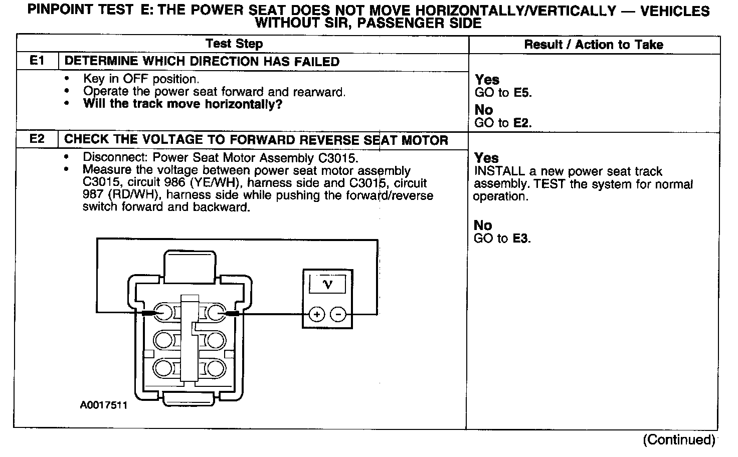 PINPOINT TEST E: THE POWER SEAT DOES NOT MOVE HORIZONTALLY/VERTICALLY - VEHICLES WITHOUT SIR, PASSENGER SIDE