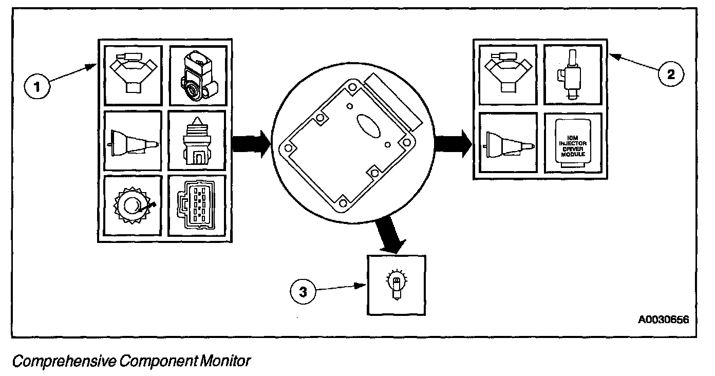 The Comprehensive Component Monitor (CCM) is an on-board strategy designed to monitor a fault in any electronic component or circuit that provides input or output signal to the Powertrain Control Module (PCM) and is not exclusively monitored by another monitor system. Inputs and outputs are considered inoperative when a failure exists due to a lack of circuit continuity, out-of-range value, or a failed rationality check.