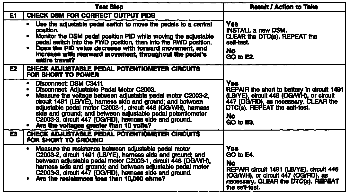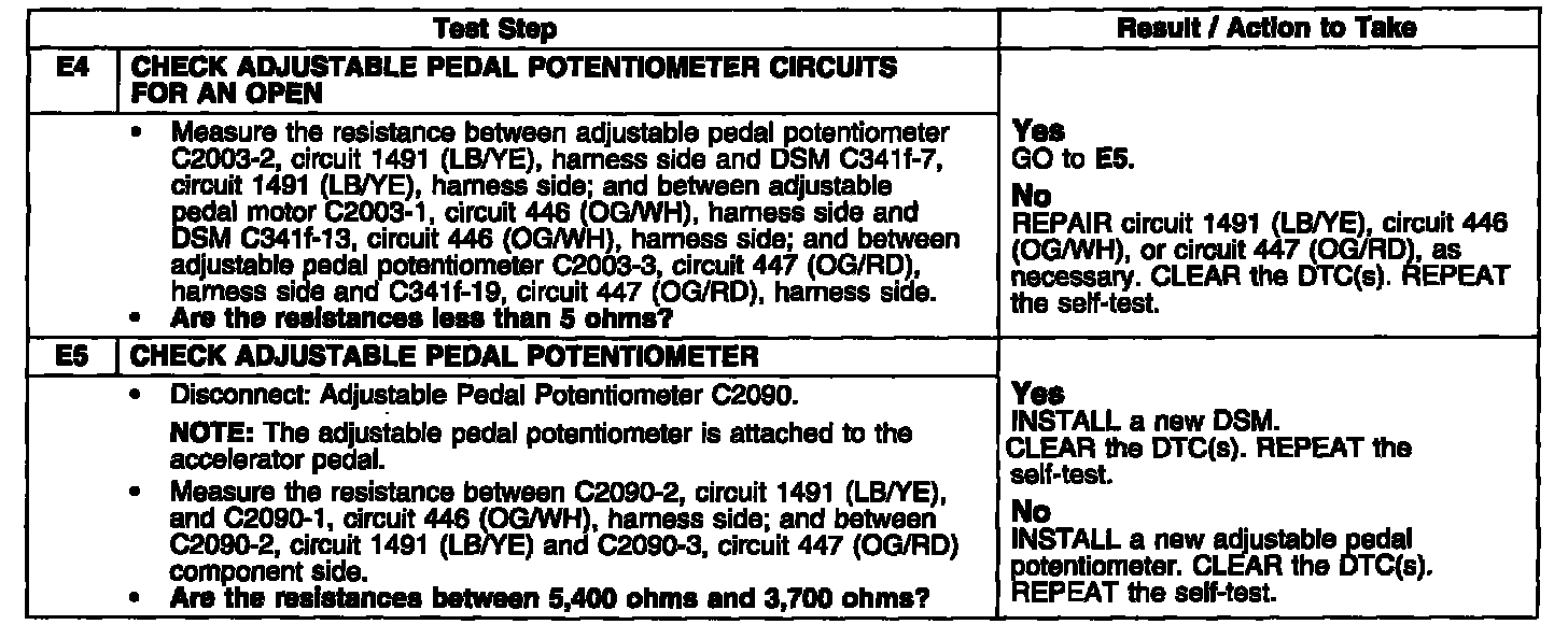 Depending on pedal position, the adjustable pedal potentiometer sends a resistance through feed back circuit 1491 (LB/YE) to the DSM; that value is stored in the DSM memory for recalling the position of the adjustable pedals.
