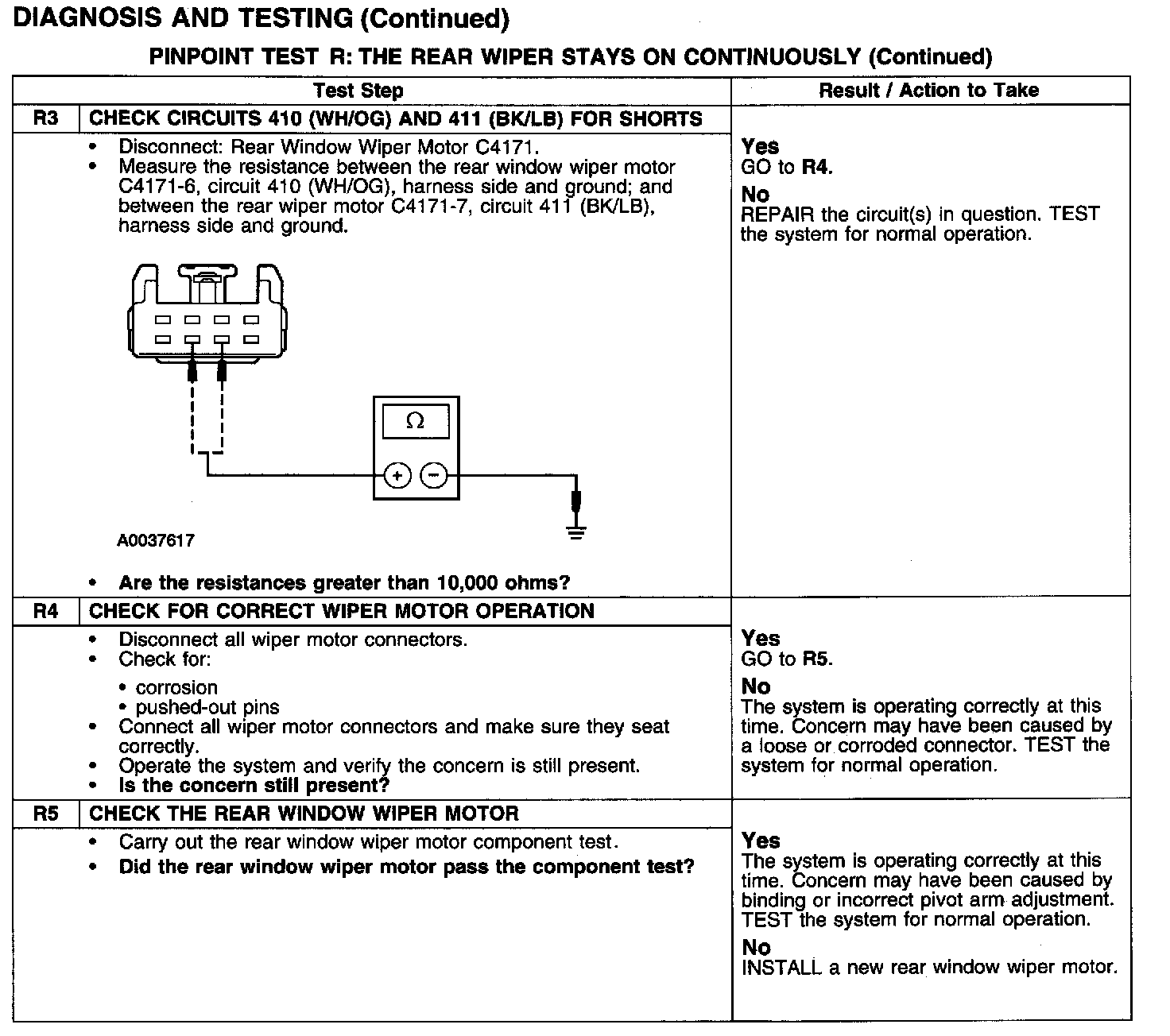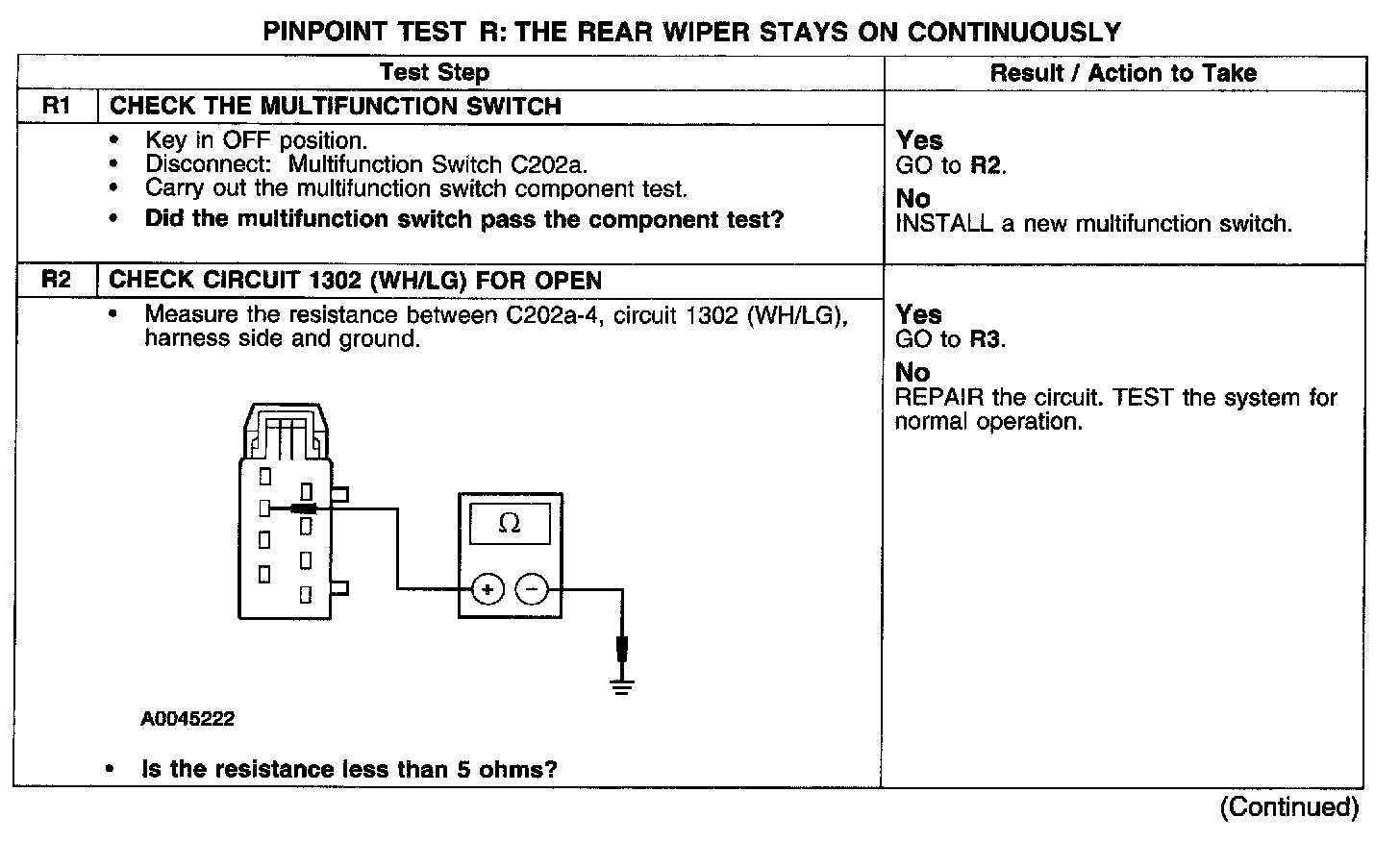 PINPOINT TEST R: THE REAR WIPER STAYS ON CONTINUOUSLYTest R1-R2: