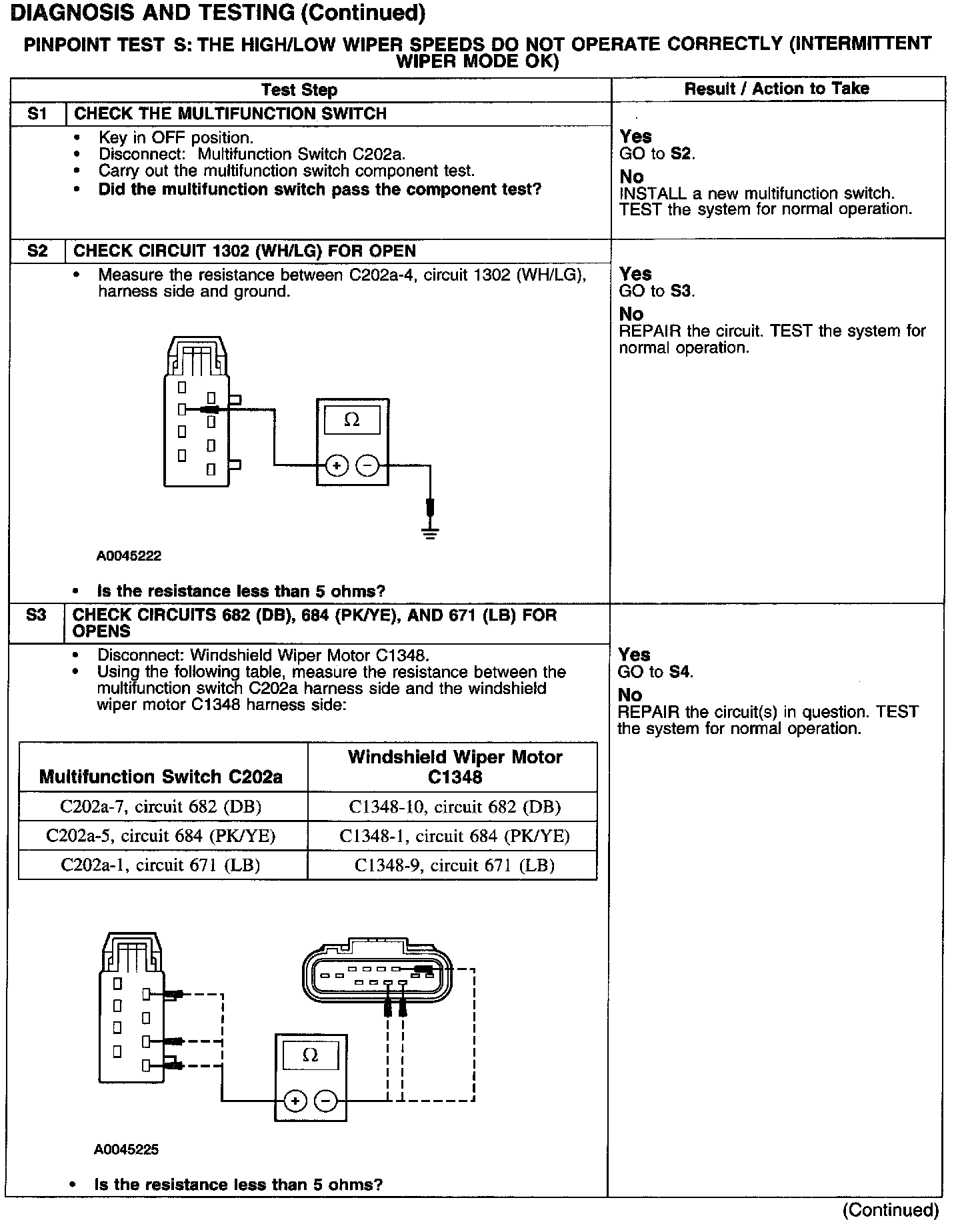PINPOINT TEST S: THE HIGH/LOW WIPER SPEEDS DO NOT OPERATE CORRECTLY (INTERMITTENT WIPER MODE OK)Test S1-S3: