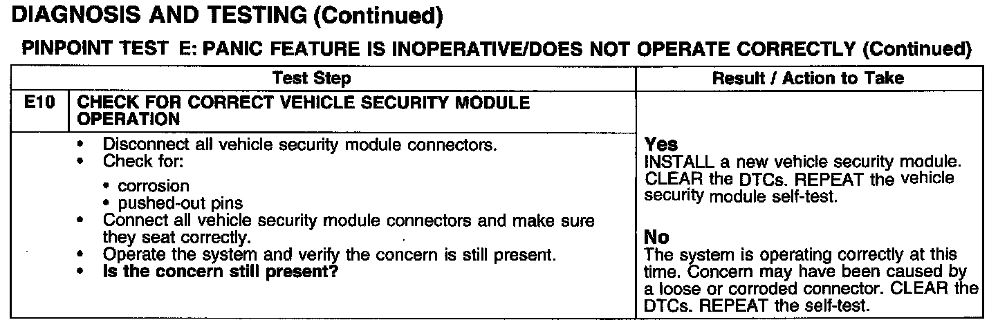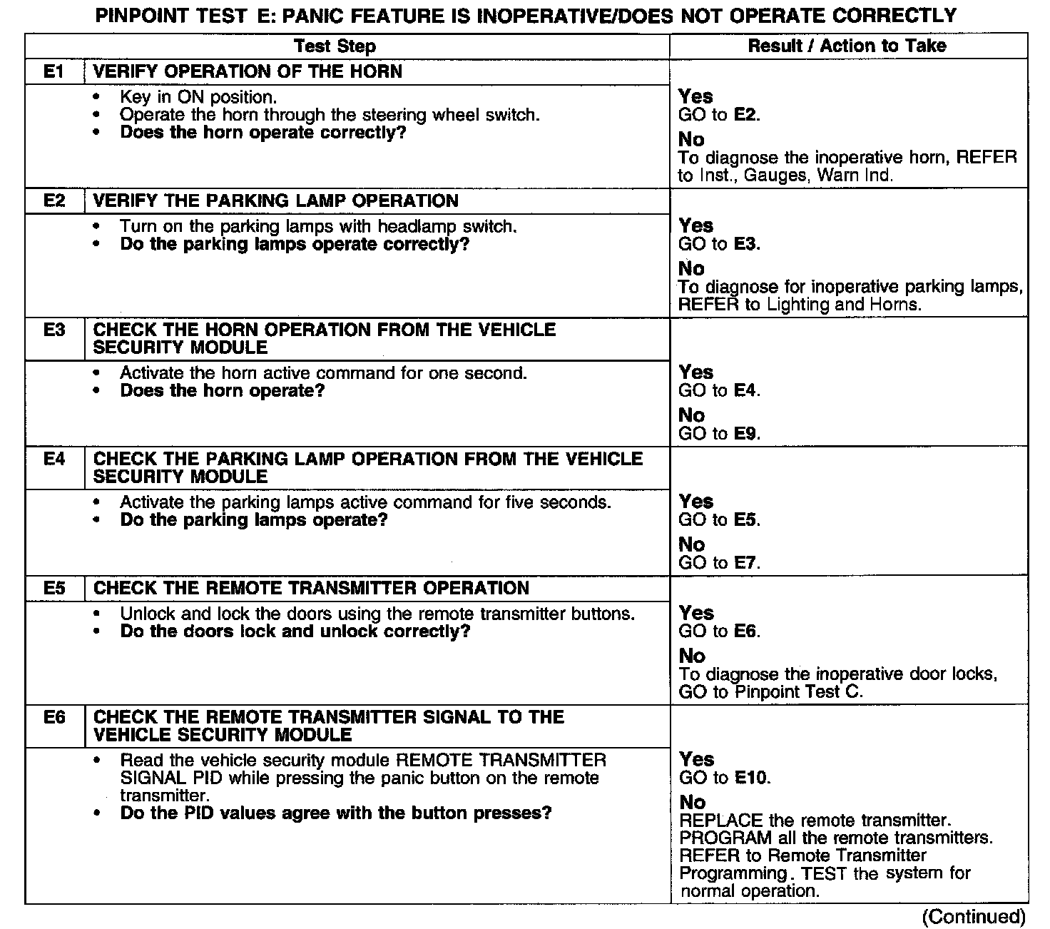 PINPOINT TEST E: PANIC FEATURE IS INOPERATIVE/DOES NOT OPERATE CORRECTLYTest E1-E6: