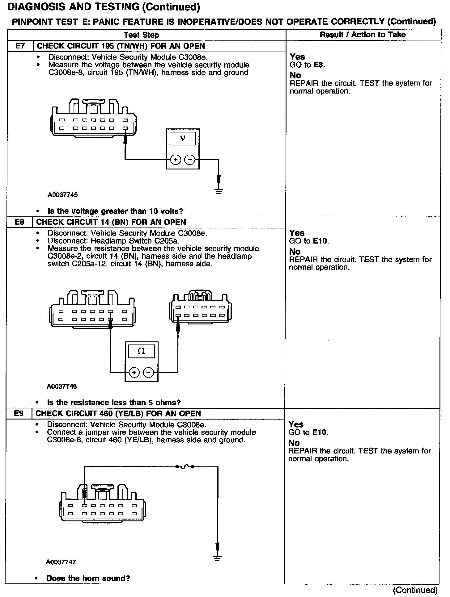 With the panic feature activated, the vehicle security module supplies ground to circuit 460 (YE/LB), energizing the horn relay which supplies power to circuit 6 (YE/LG). This activates the horn and circuit 14 (BN) to activate the parking lamps.
