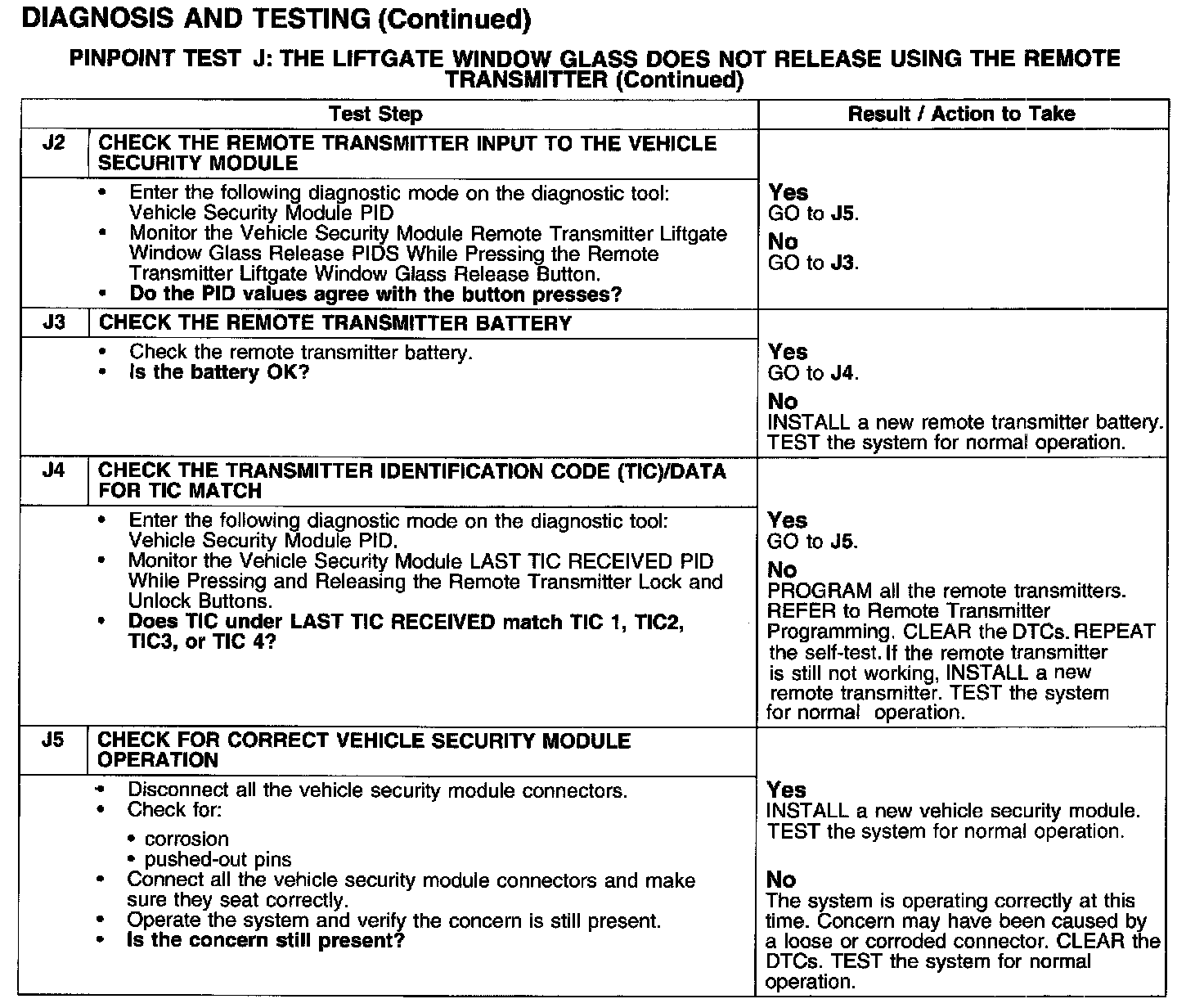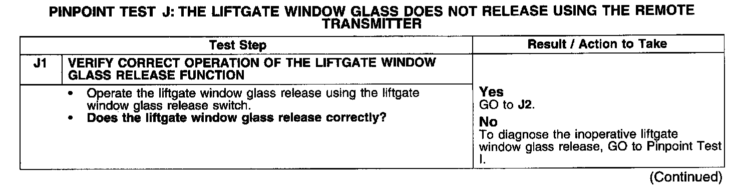 PINPOINT TEST J: THE LIFTGATE WINDOW GLASS DOES NOT RELEASE USING THE REMOTE TRANSMITTERTest J1: