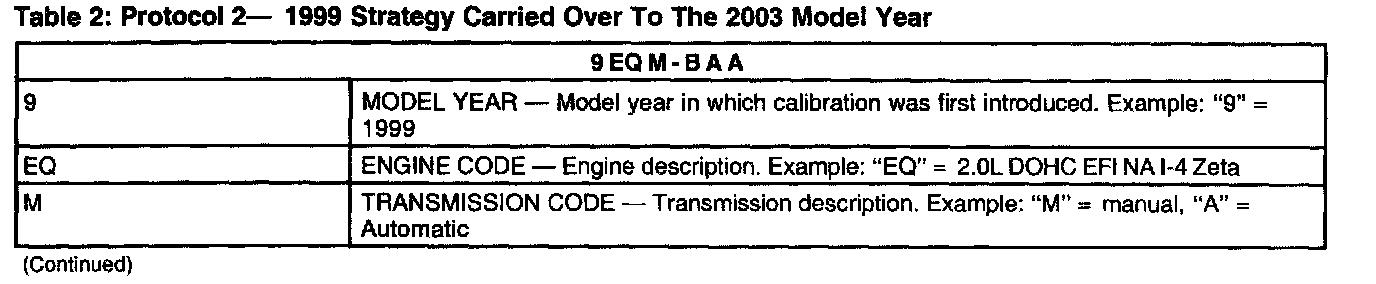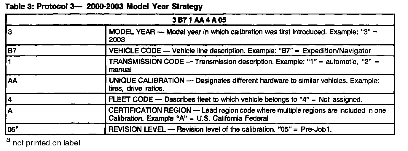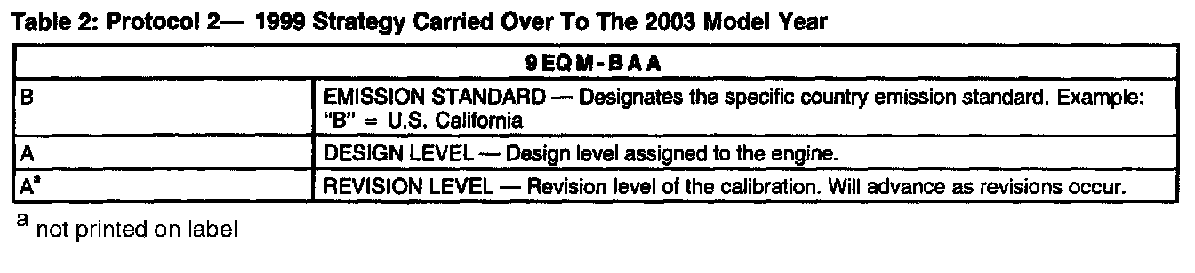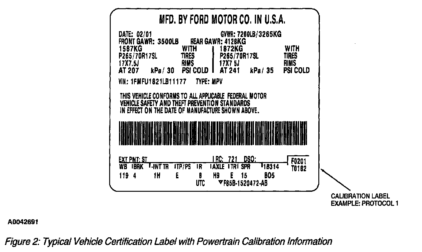 Powertrain Base Calibration Information is located in the lower right corner of the Vehicle Certification Label. Only the Base Calibration will appear on this label (Figure 2). The Revision Level is no longer printed on the label; however, it can be found in On-Line Automotive Service Information System (OASIS). For the current model year Ford Motor Company is using three different Protocols which describe Powertrain Base Calibration. The Protocols are designed to provide worldwide standardization for vehicle calibration. If the Electronic Calibration strategy has been used since 1998 and carried over to the current model year, Protocol 1 is used (see table 1). If the Electronic Calibration strategy has been used since 1999 and carried over to the current model year, Protocol 2 is used (see table 2). For Electronic Calibration strategies introduced in the 2000 or later model years, Protocol 3 is used (see table 3). For more information on Vehicle Certification Label or Powertrain Calibration, refer to the Vehicle Systems.