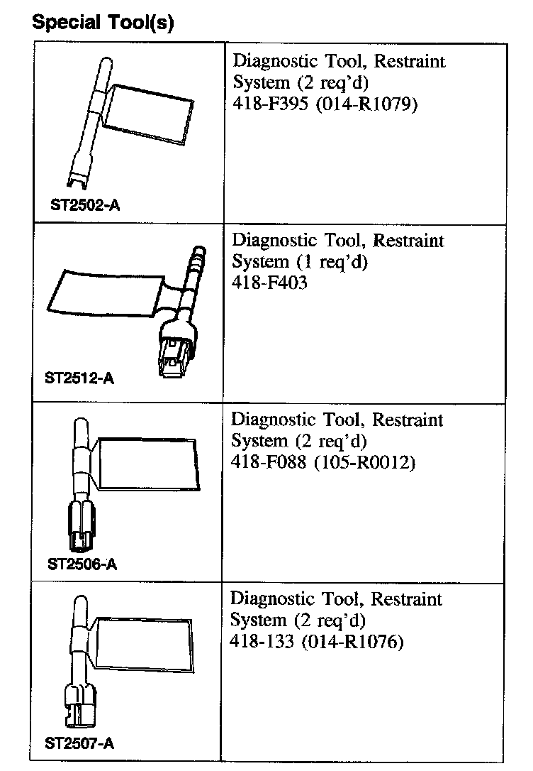 - Restraint system diagnostic tools MUST be installed under the seats in the seat side air bag (if equipped) and safety belt pretensioner (if equipped) to floor connectors.