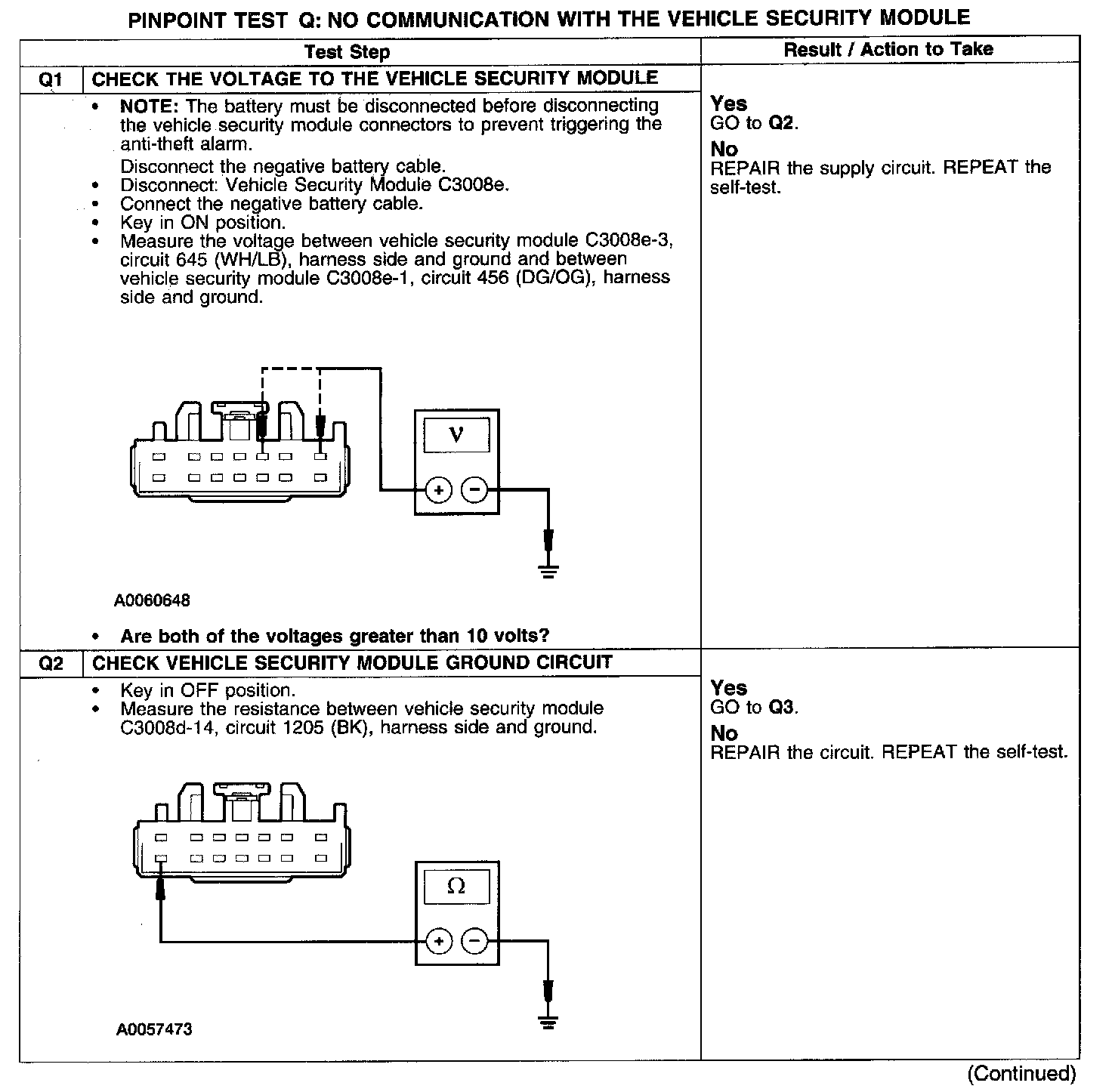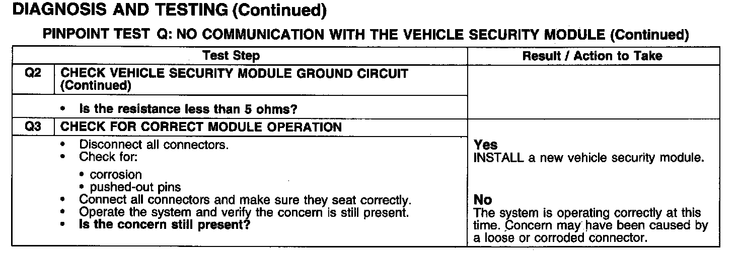 PINPOINT TEST Q: NO COMMUNICATION WITH THE VEHICLE SECURITY MODULETest Q1-Q2: