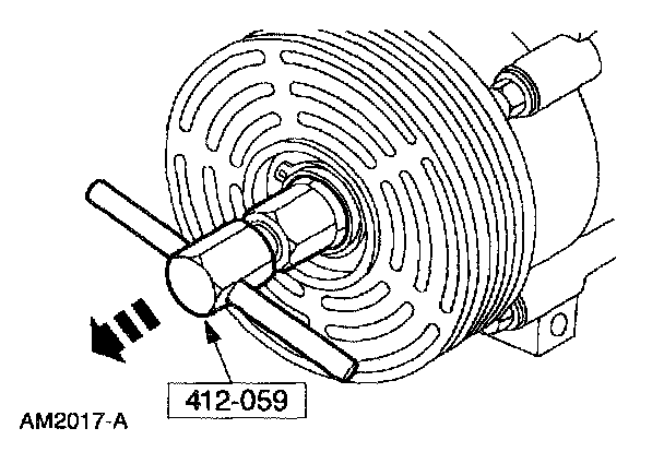 5. Rotate the special tool to position the tool tip and the snap ring eye closest to the A/C compressor shaft.