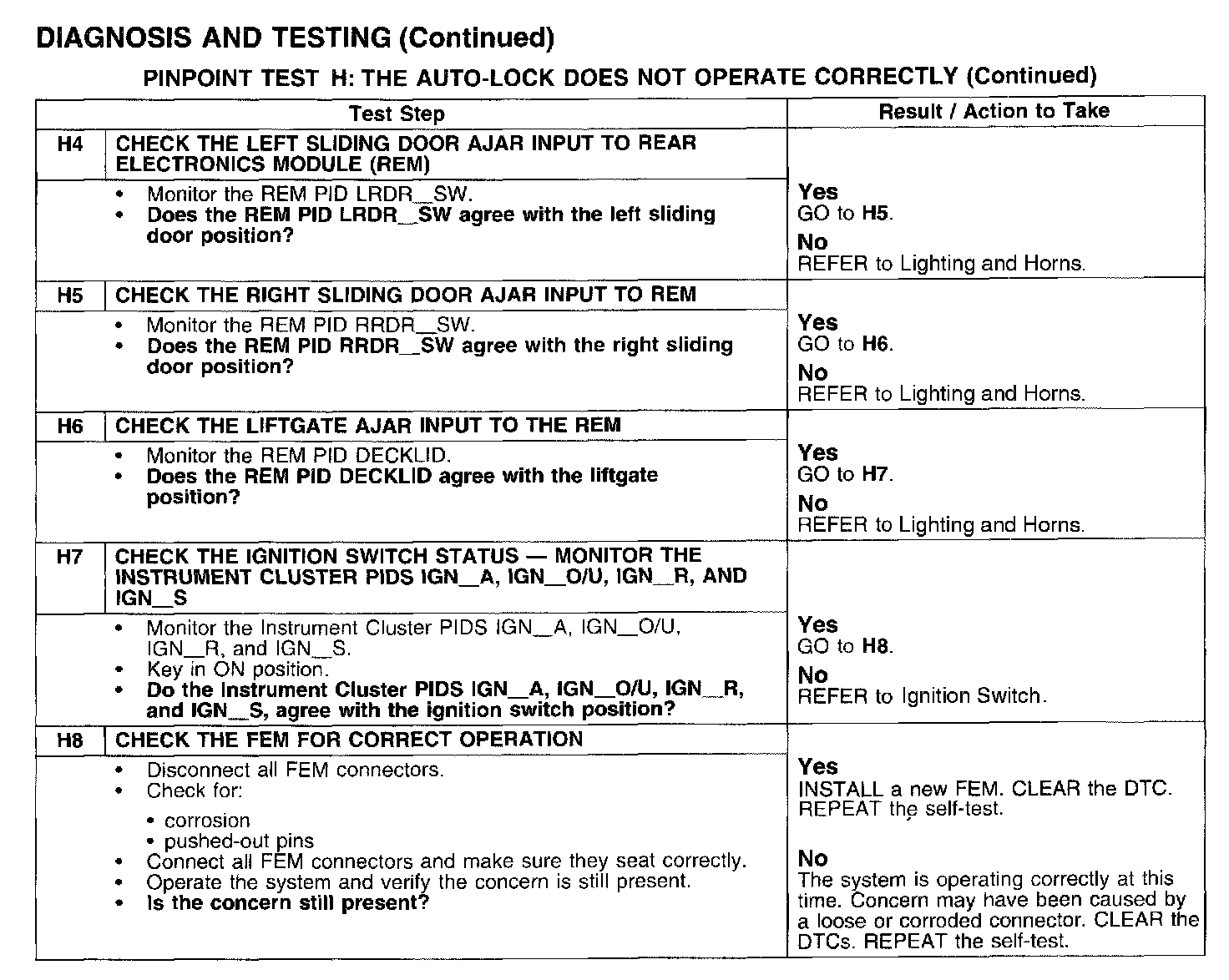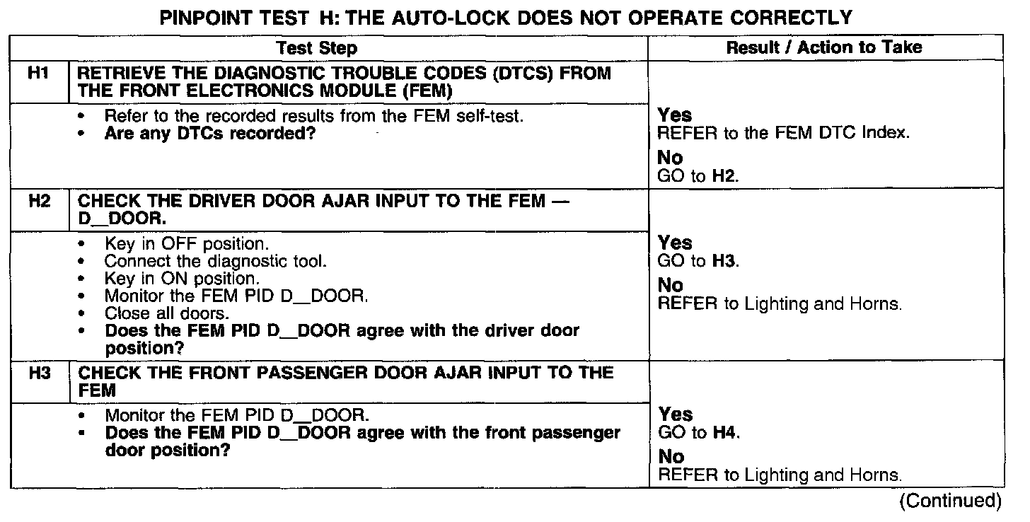 PINPOINT TEST H: THE AUTO-LOCK DOES NOT OPERATE CORRECTLY