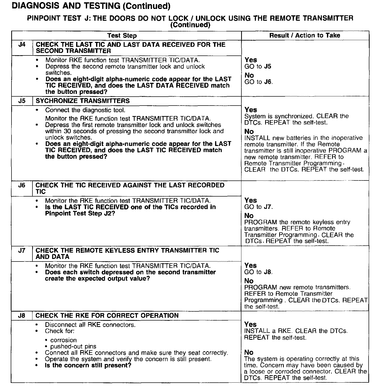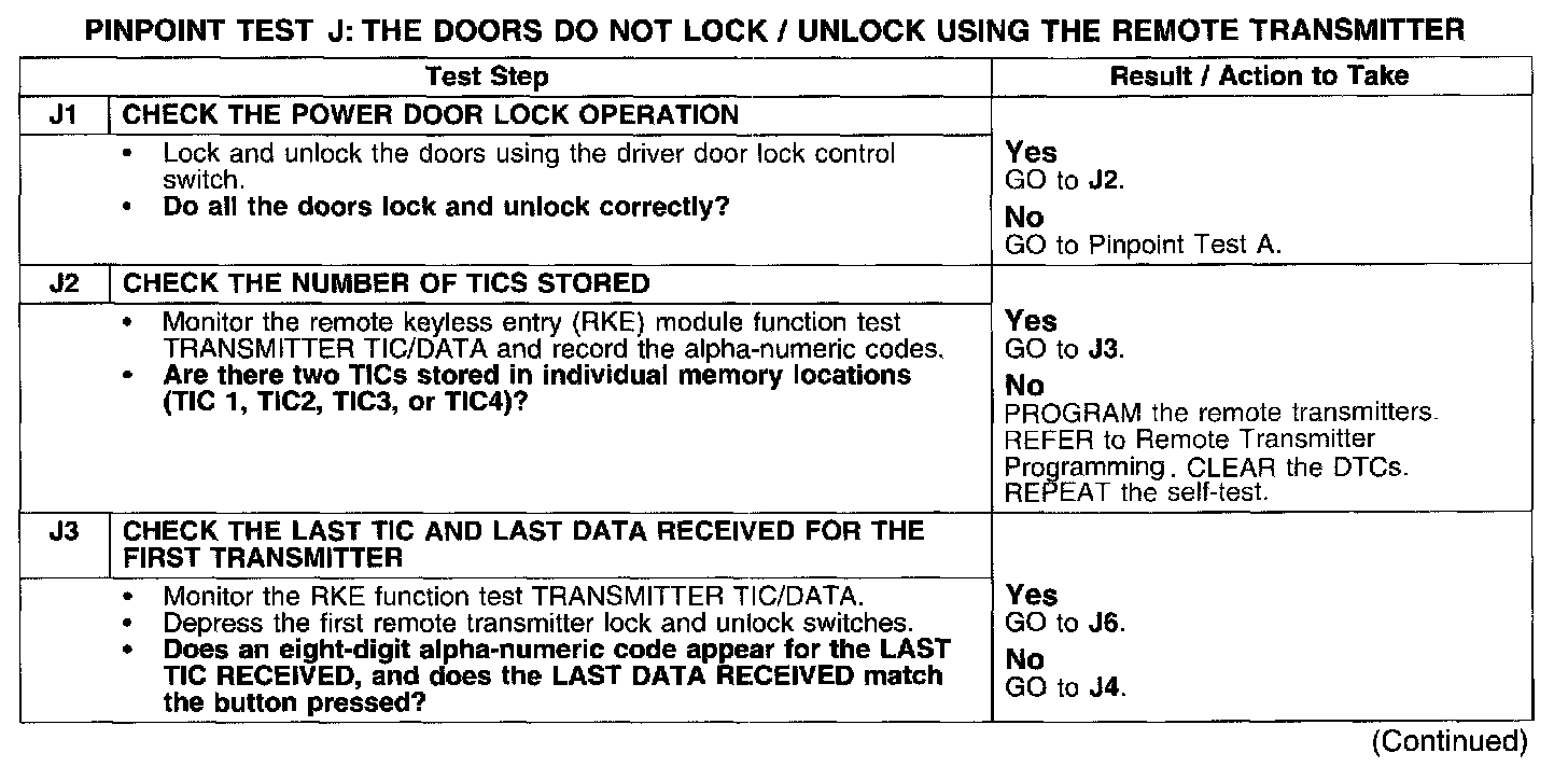 PINPOINT TEST J: THE DOORS DO NOT LOCK / UNLOCK USING THE REMOTE TRANSMITTER