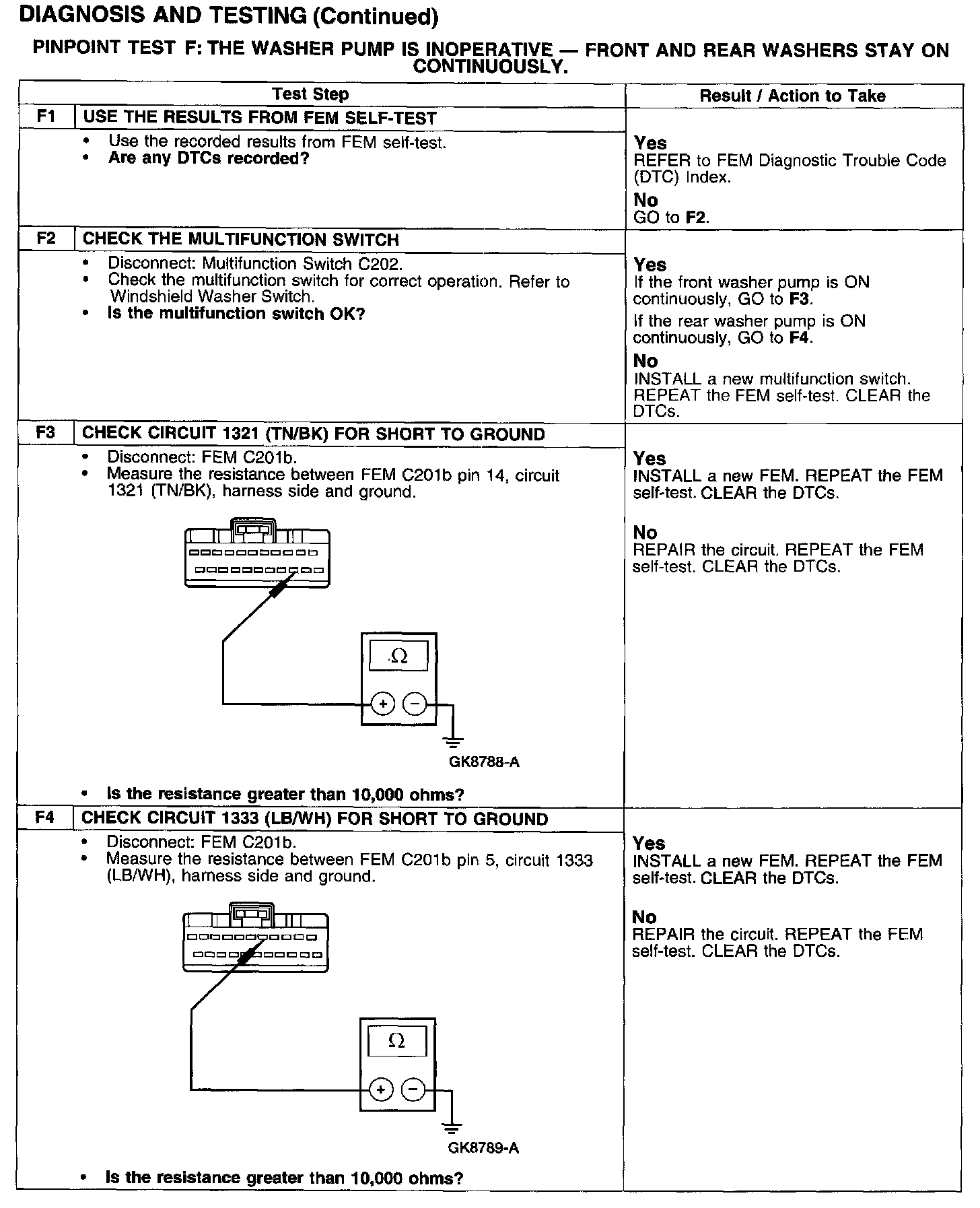PINPOINT TEST F: THE WASHER PUMP IS INOPERATIVE - FRONT AND REAR WASHERS STAY ON CONTINUOUSLY