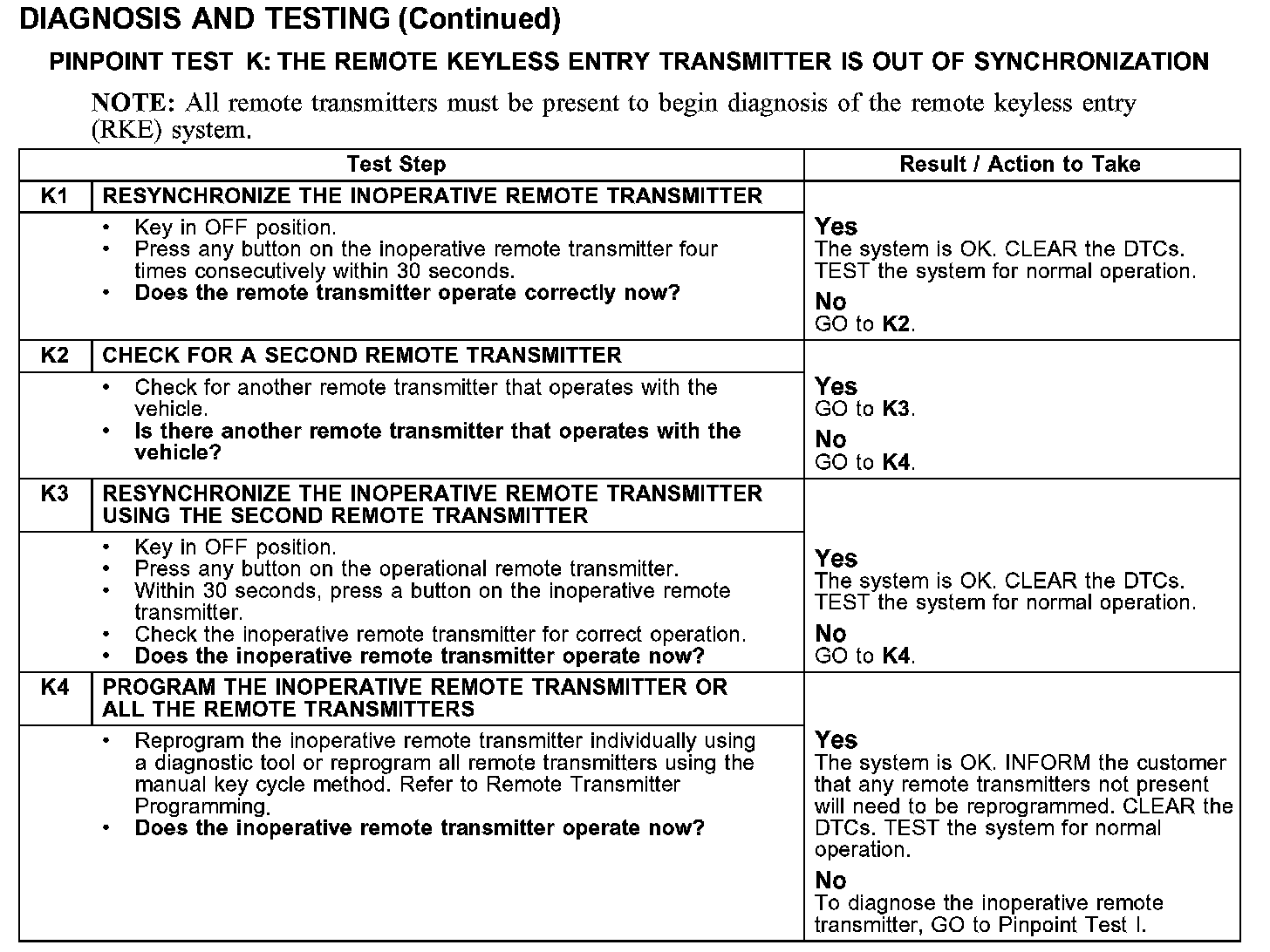 PINPOINT TEST K: THE REMOTE KEYLESS ENTRY TRANSMITTER IS OUT OF SYNCHRONIZATION