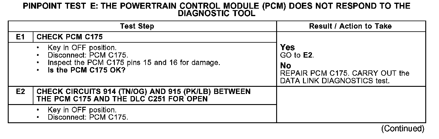PINPOINT TEST E: THE POWERTRAIN CONTROL MODULE (PCM) DOES NOT RESPOND TO THE DIAGNOSTIC TOOL
